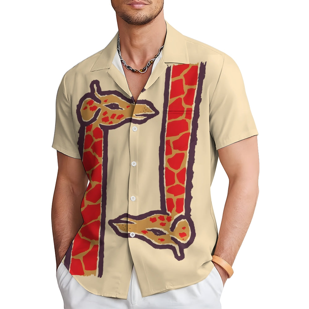 Upside-Down Giraffe Print Chest Pocket Short Sleeve Shirt 2411006001