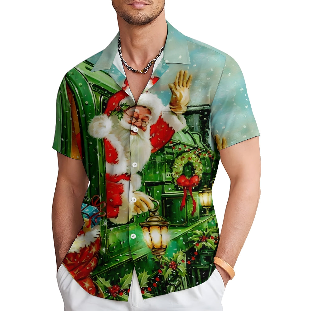 Christmas Santa Claus Green Train Casual Short Sleeve Shirt 2411003259