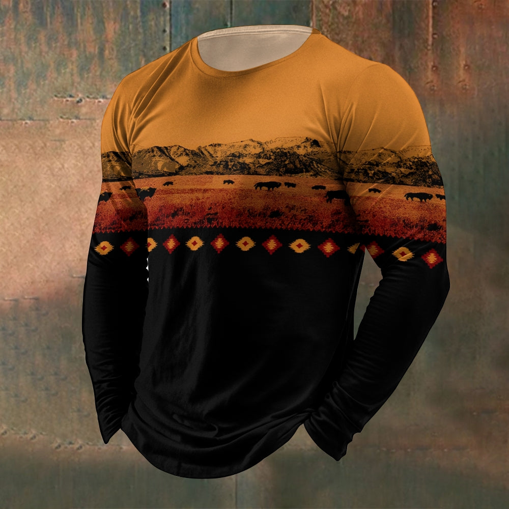 Men's Crew Neck Vintage Prairie Cow Print Long Sleeve T-Shirt 2411002501