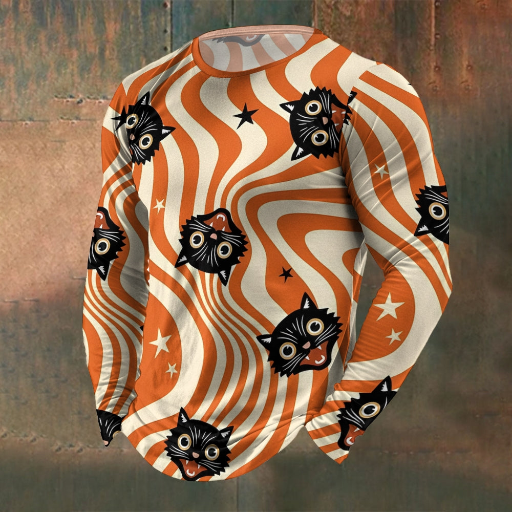 Men's Crew Neck Black Cat Curve Print Long Sleeve T-Shirt 2411002508