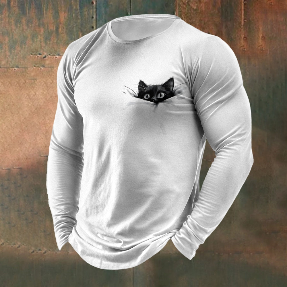 Men's Crew Neck Black Cat Print Long Sleeve T-Shirt 2411002517