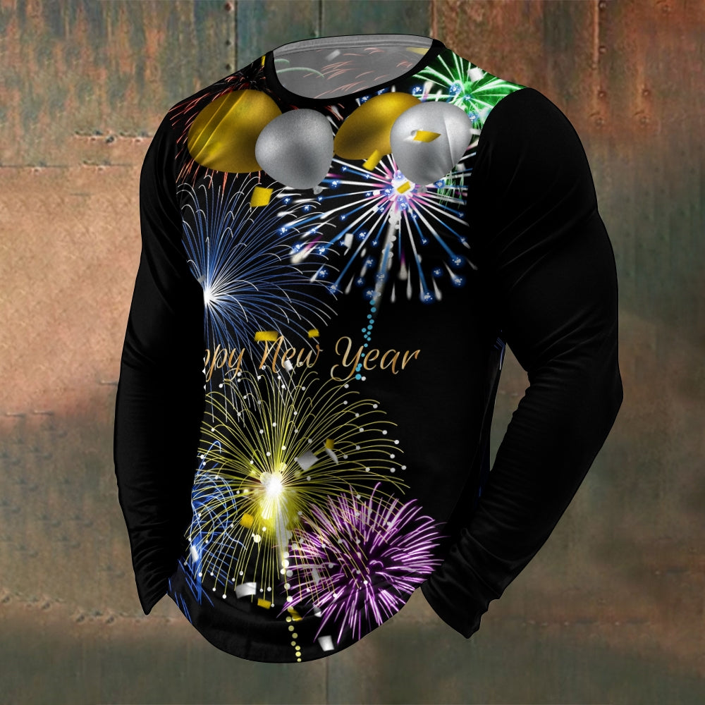 Men's Crew Neck Happy New Year Fireworks Print Long Sleeve T-Shirt 2411002493