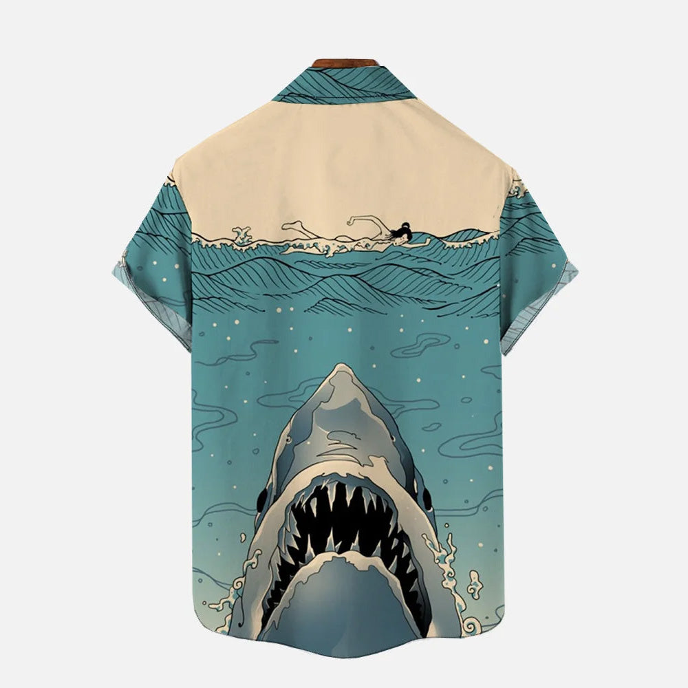 Ukiyo-e Shark Hawaiian Casual Oversized Short Sleeve Shirt