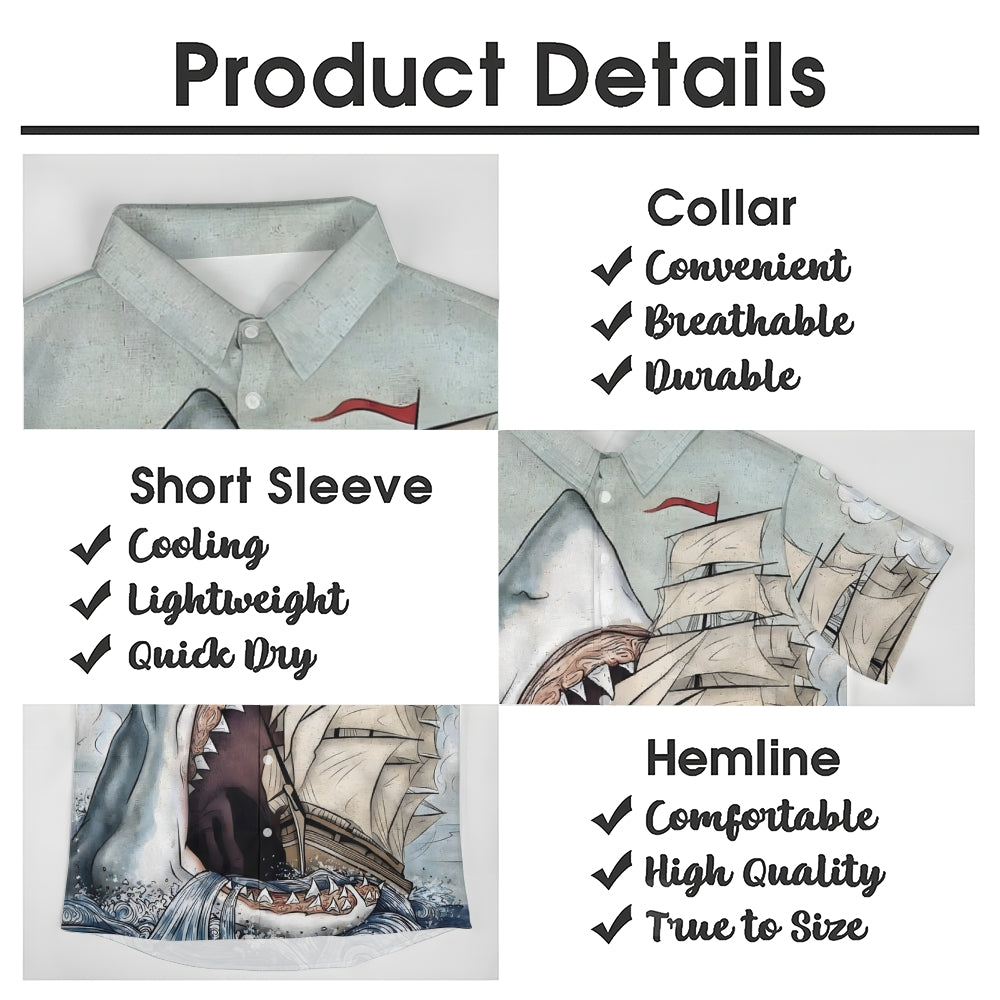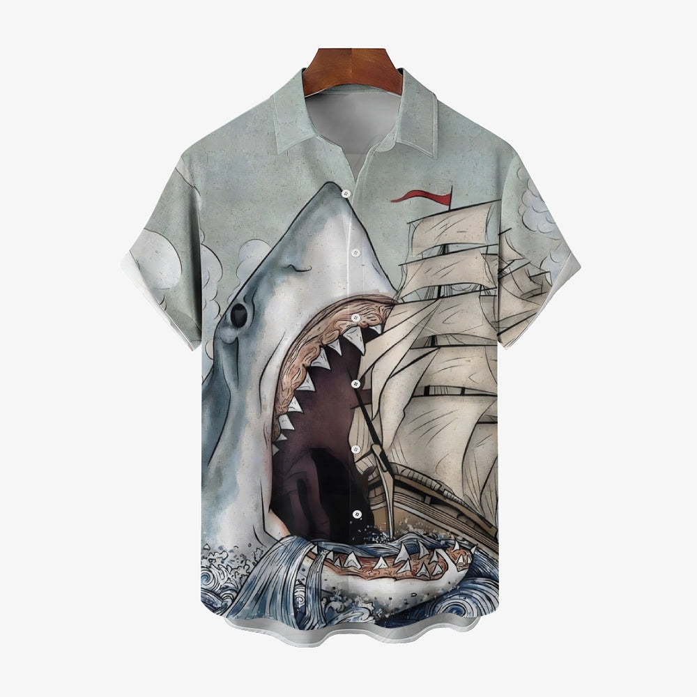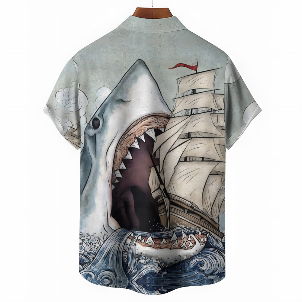 Ukiyo-E Style Retro Sailboat And Shark Print Casual Short Sleeve Shirt 2404001933