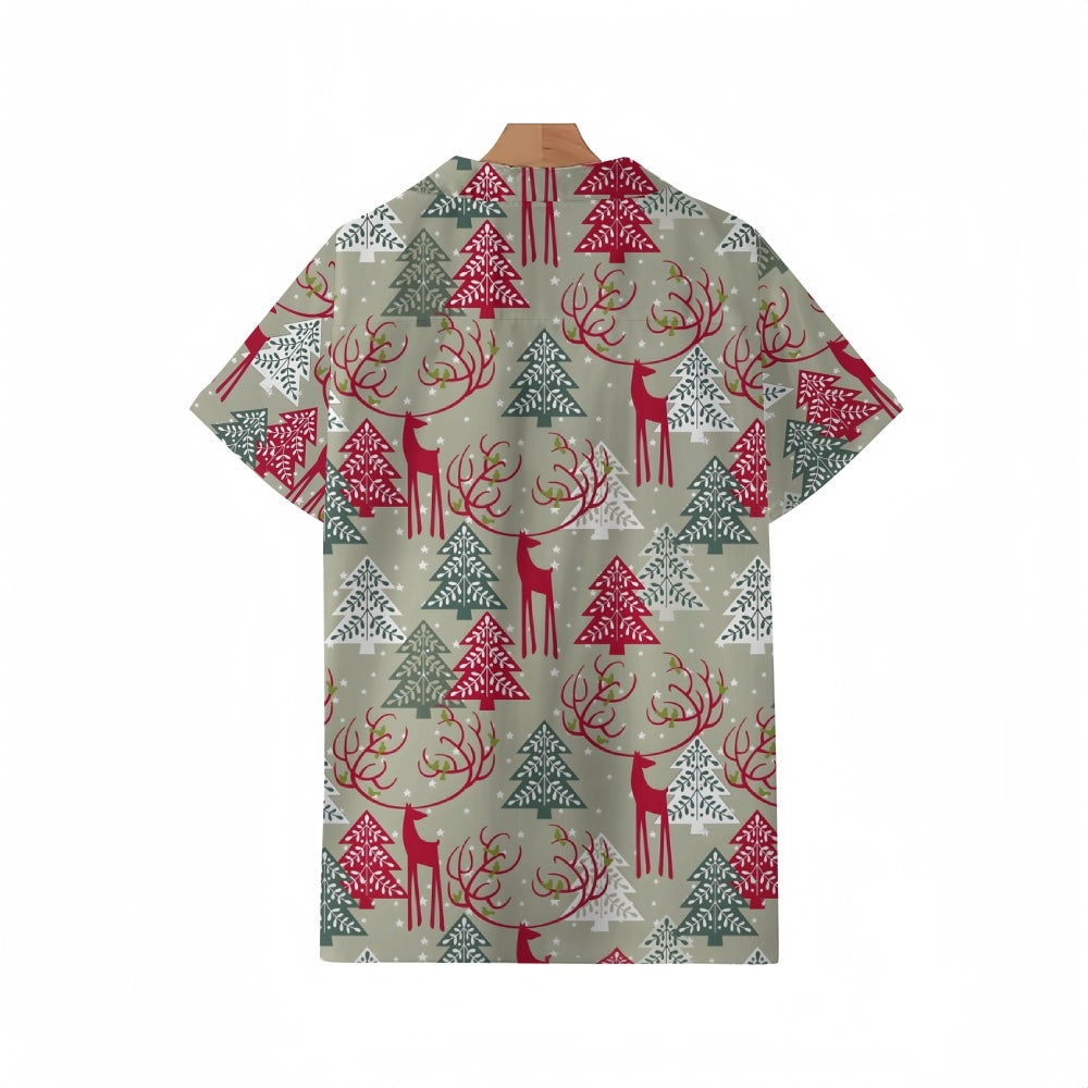 Christmas Tree And Elk Geometric Print Cuban Collar Short Sleeve Shirt 2410006104