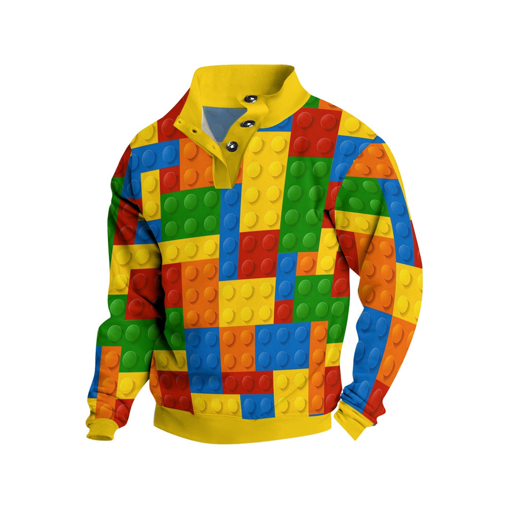 Men's Button Colored Building Blocks Casual Long Sleeve Sweatshirt 2410006864