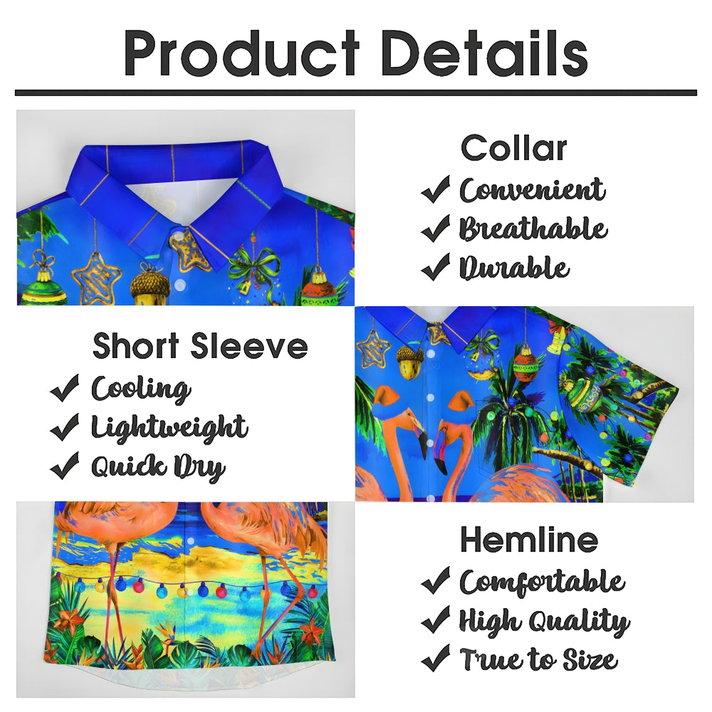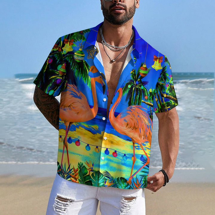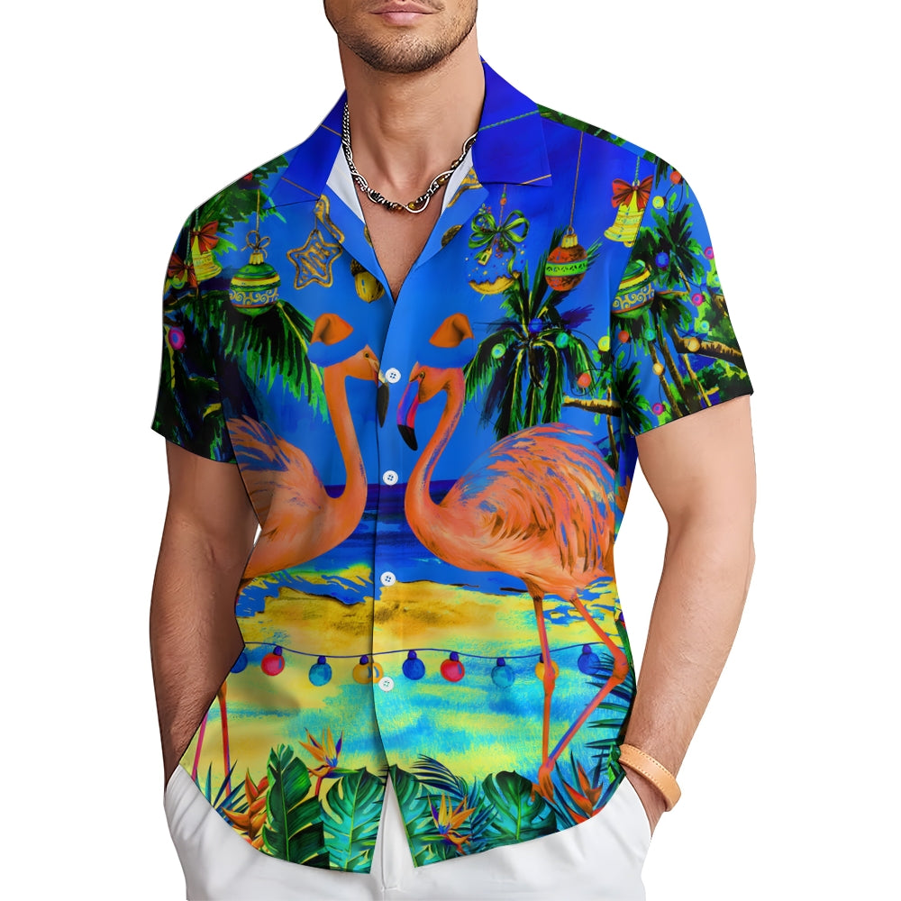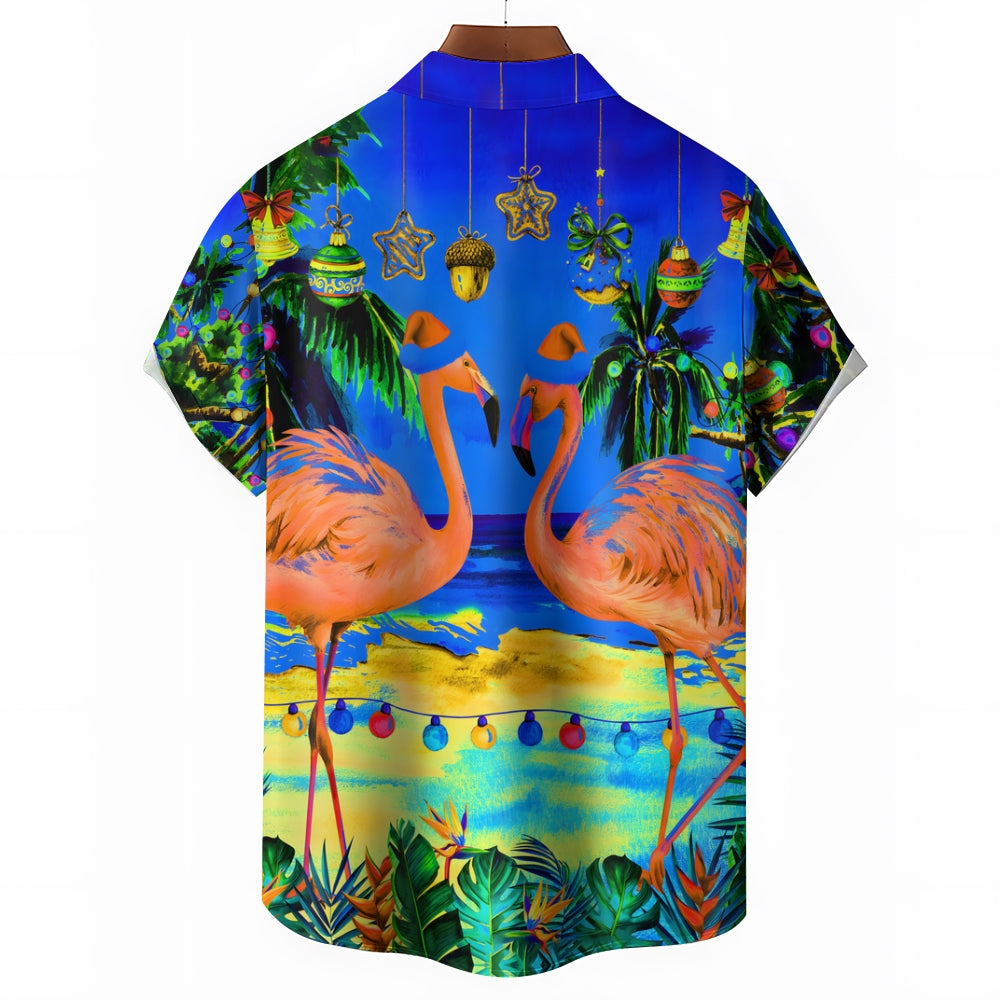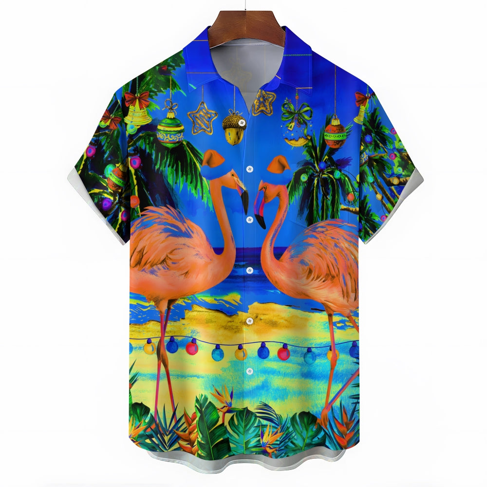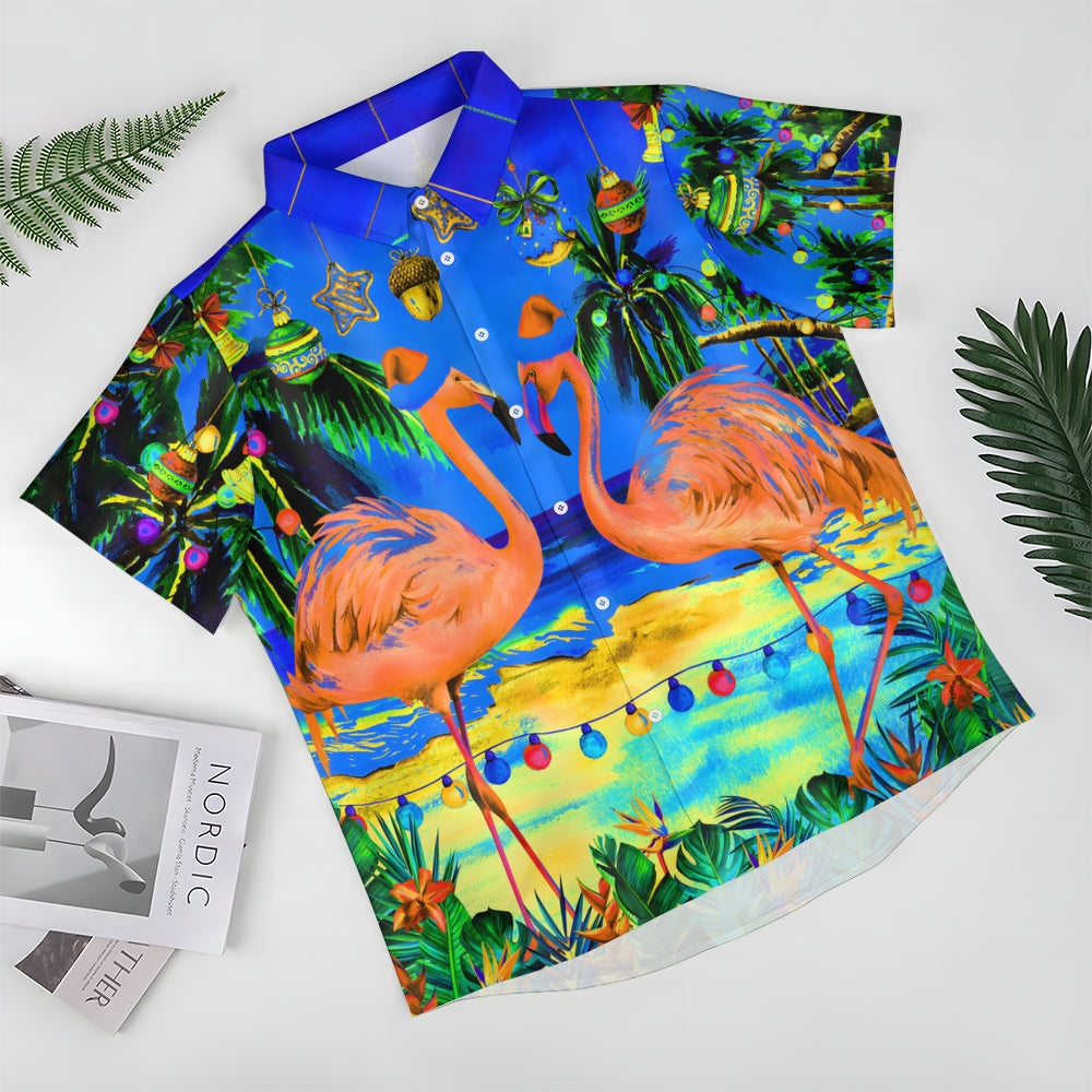 Christmas Flamingo Lantern Print Short Sleeve Shirt 2411008108