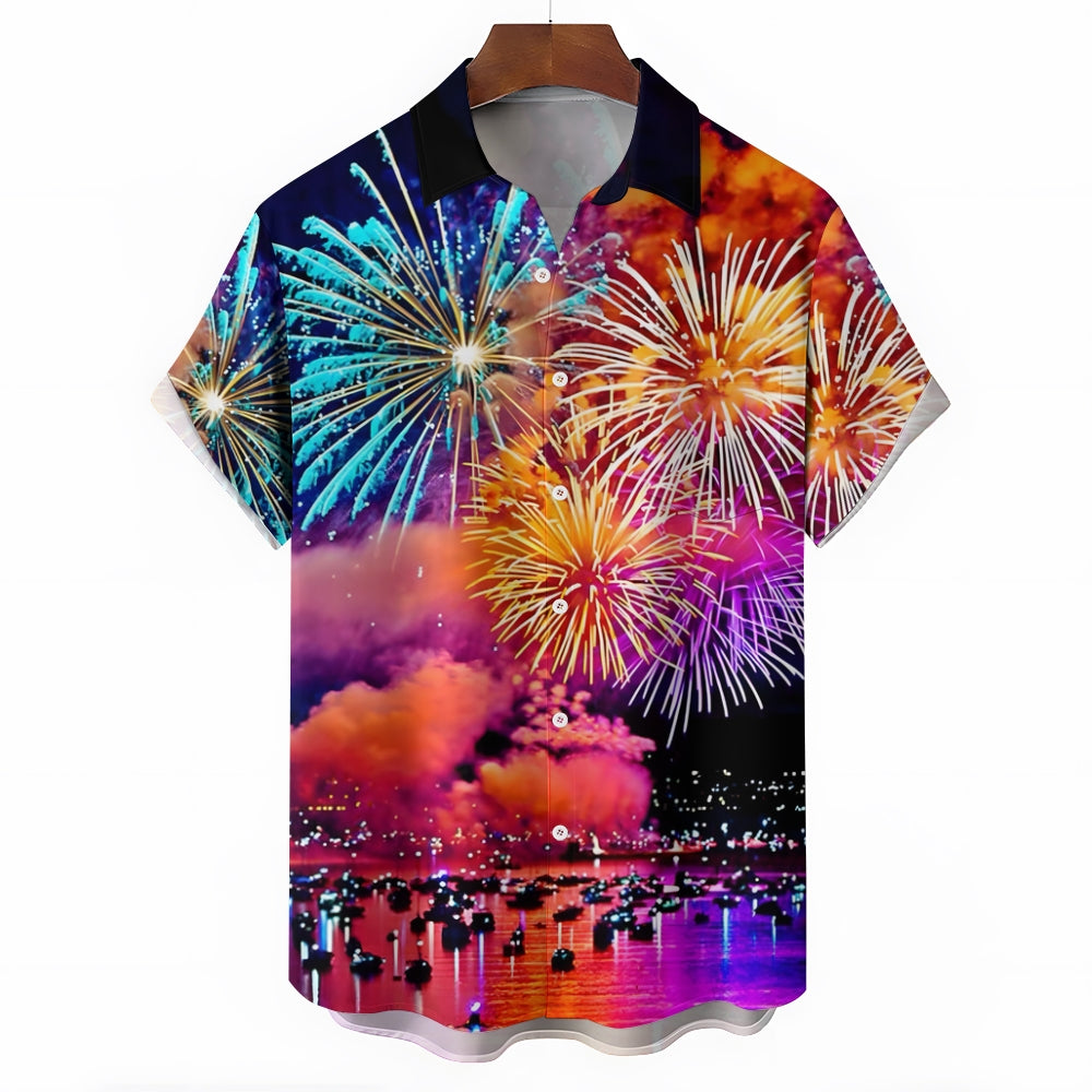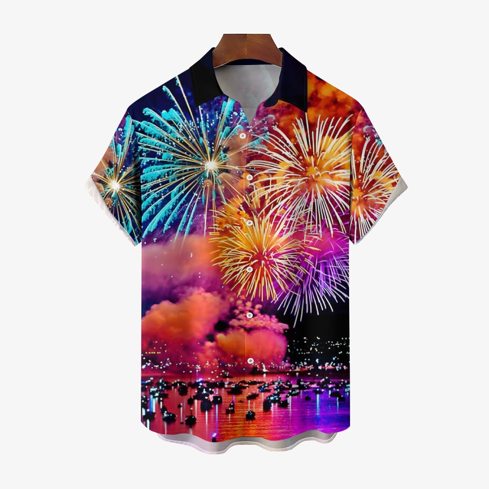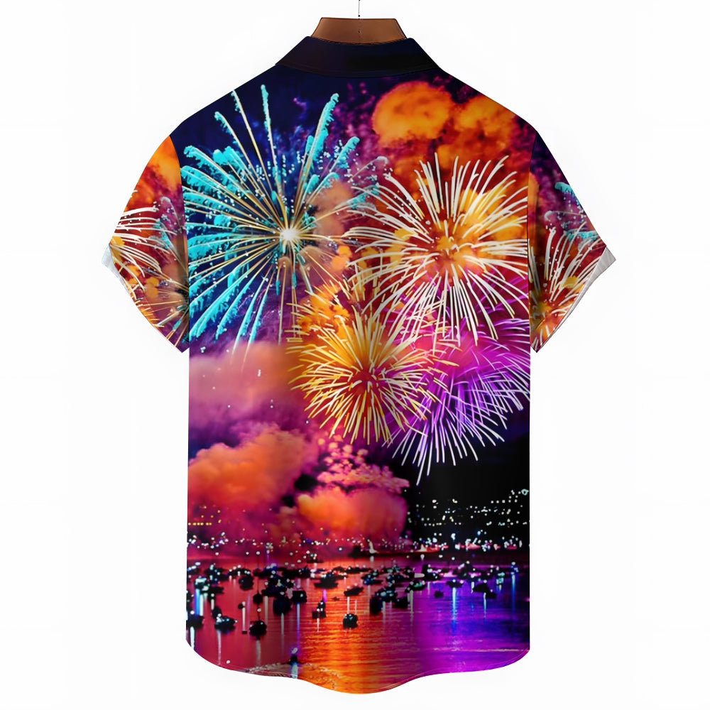 Happy New Year Fireworks Print Short Sleeve Shirt 2411011897