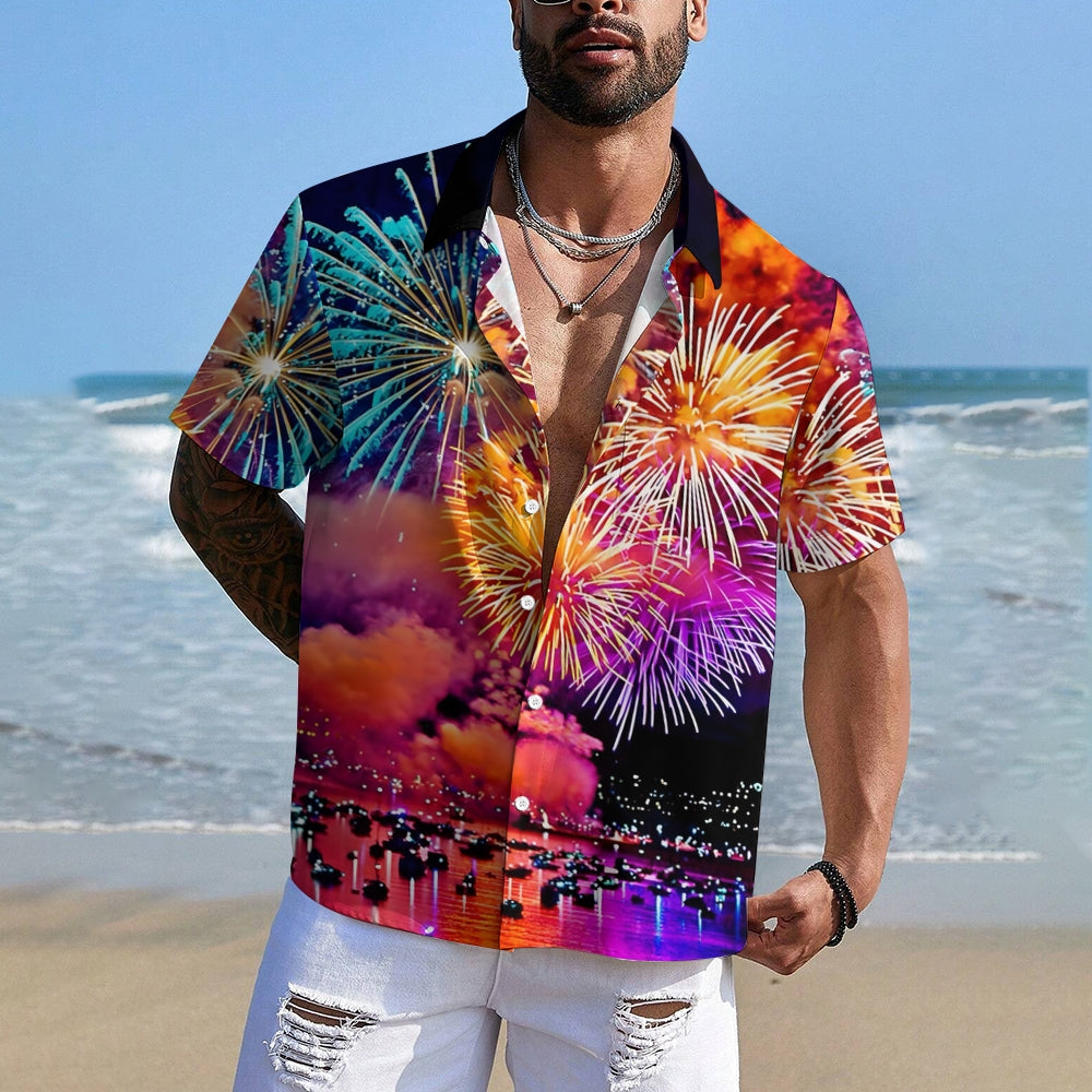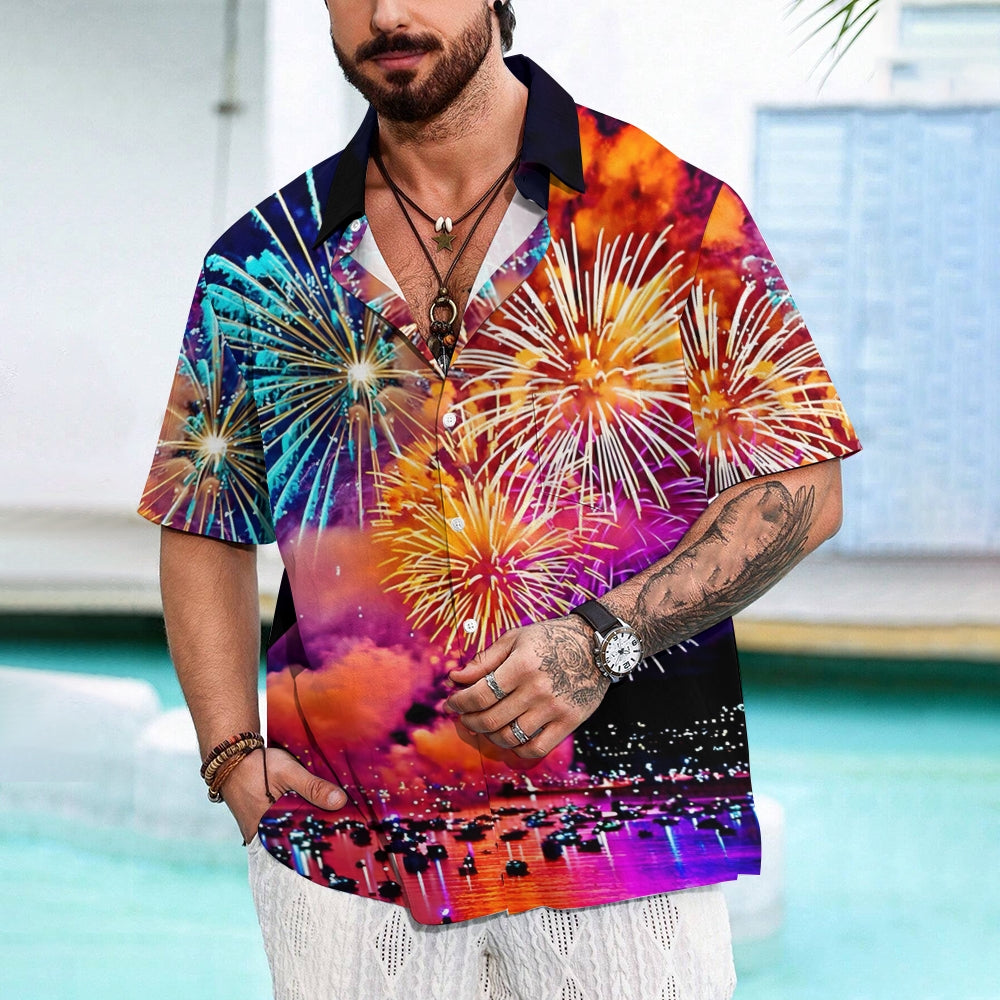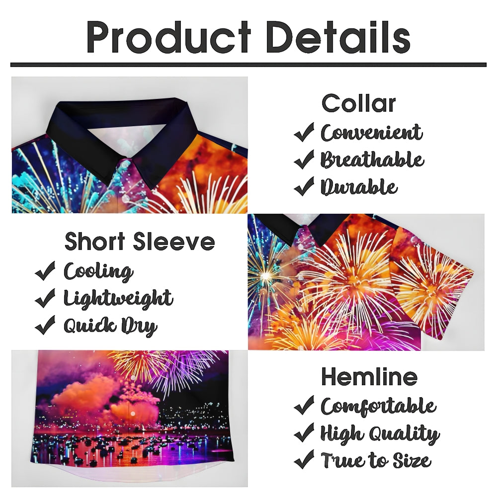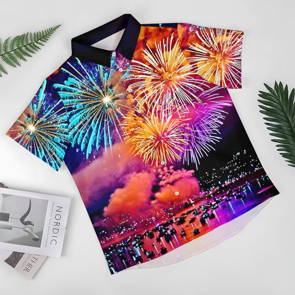 Happy New Year Fireworks Print Short Sleeve Shirt 2411011897