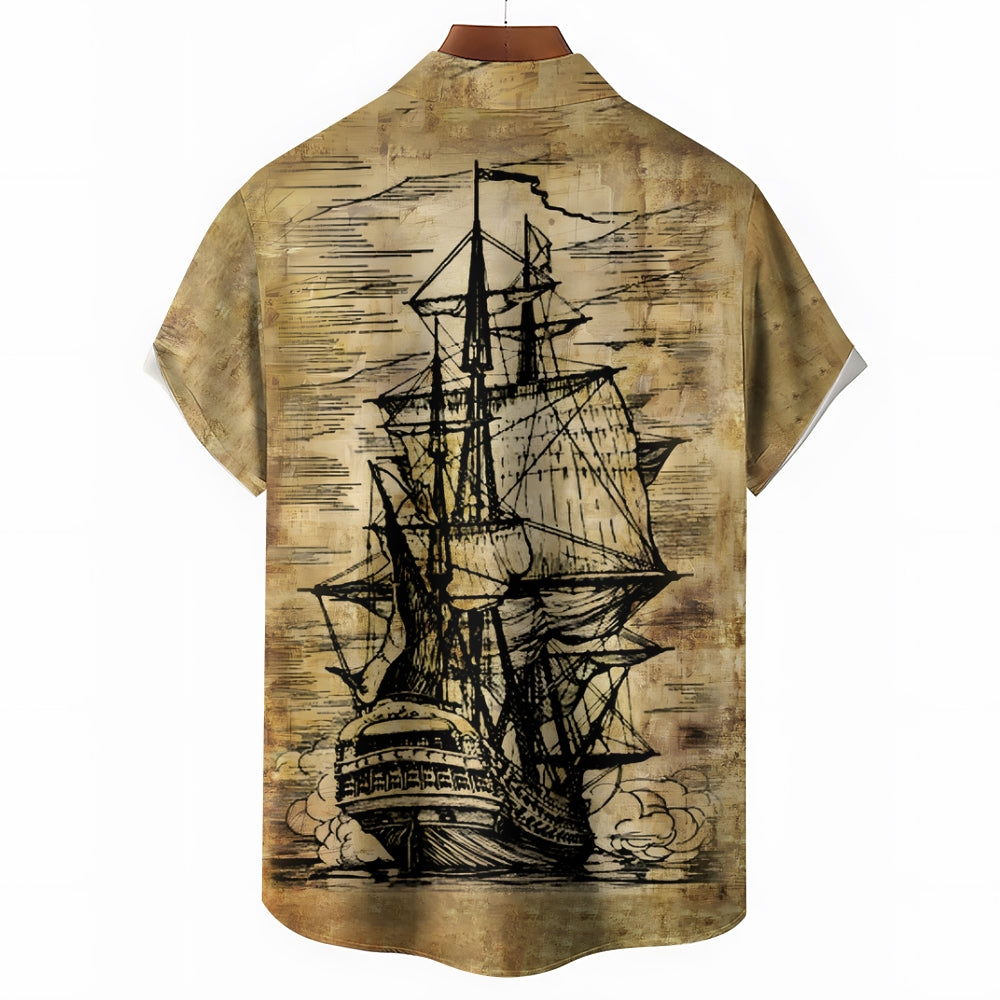 Men's Vintage Sailing Sailboat Print Short Sleeve Shirt 2412006981