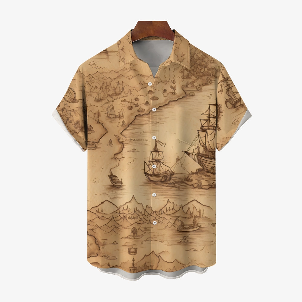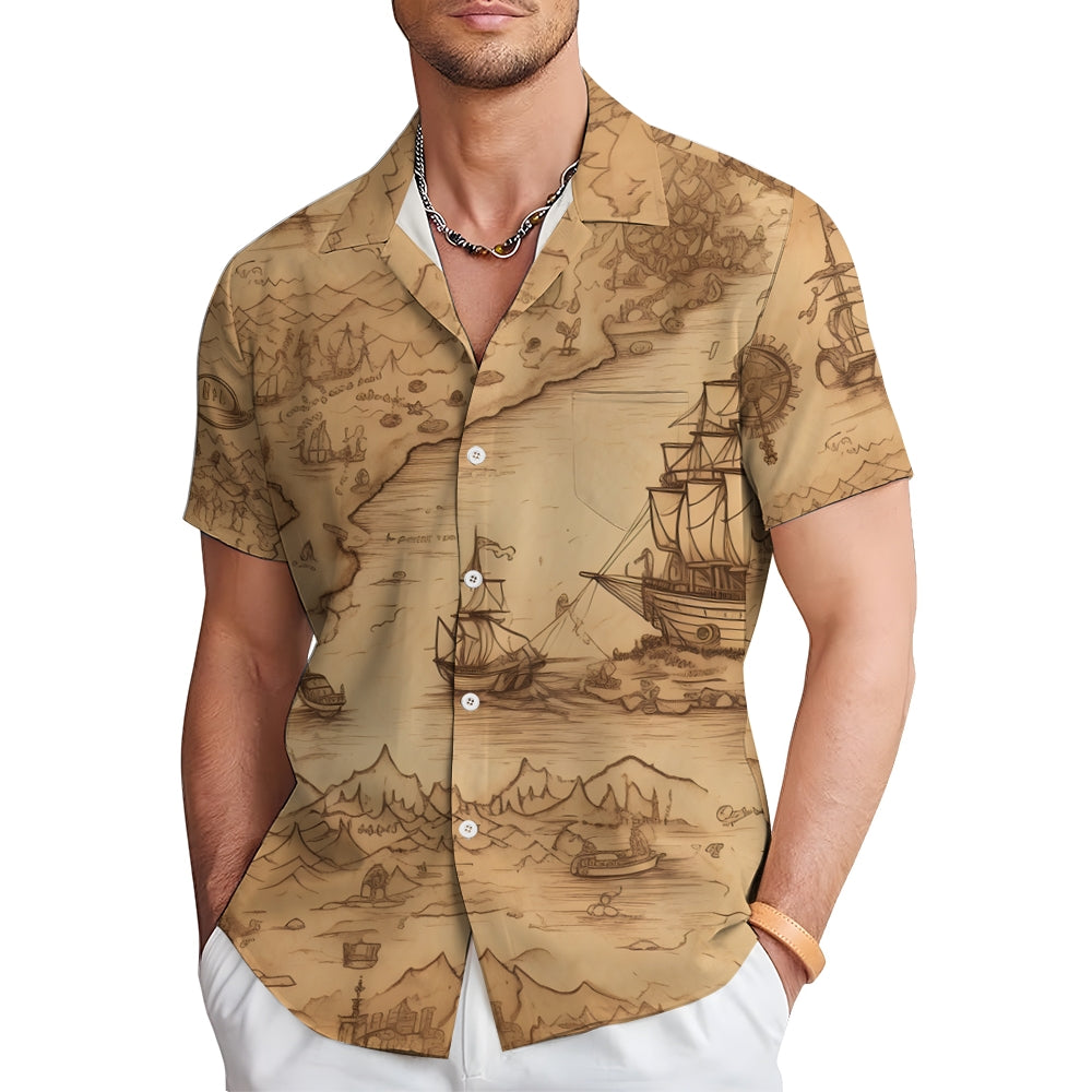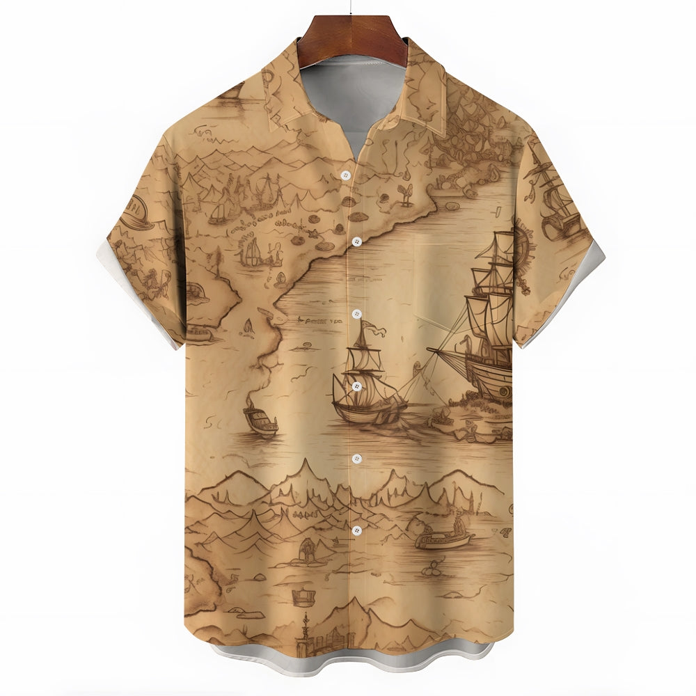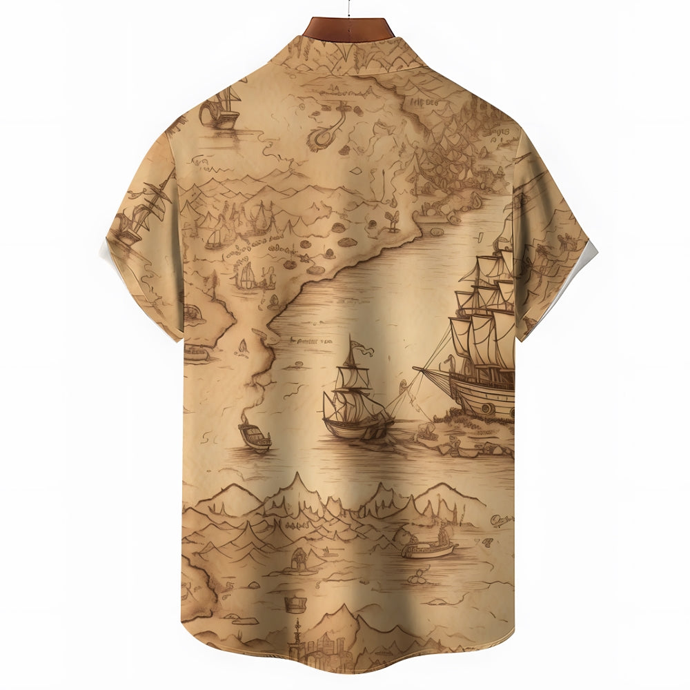 Vintage Sailing Sailboat Print Chest Pocket Short Sleeve Shirt 2411005966