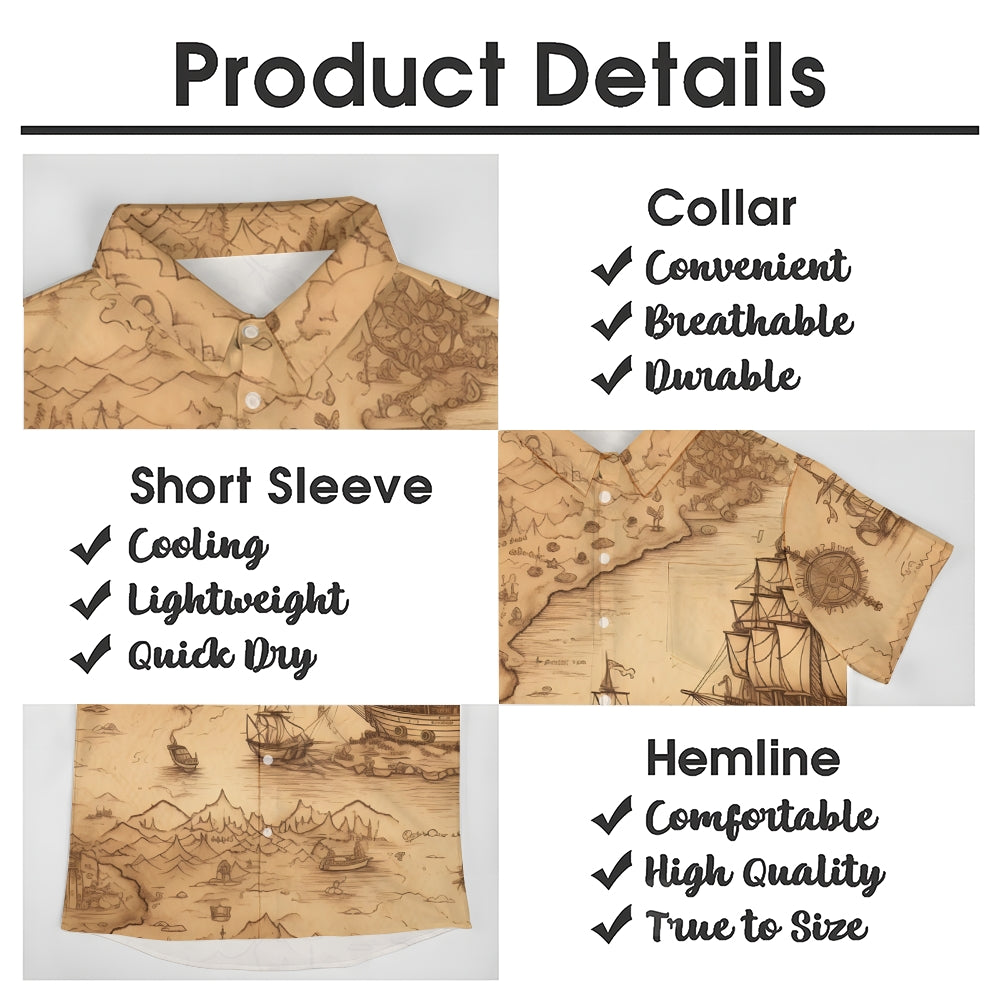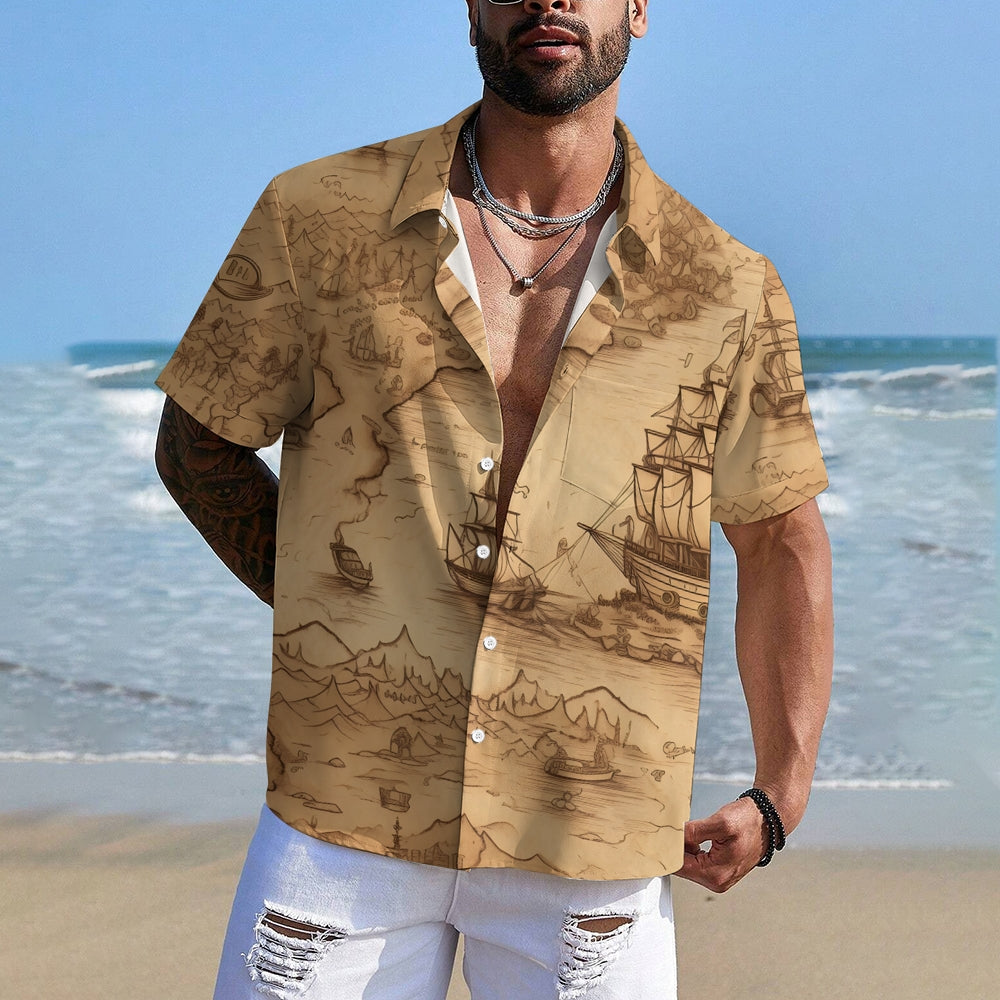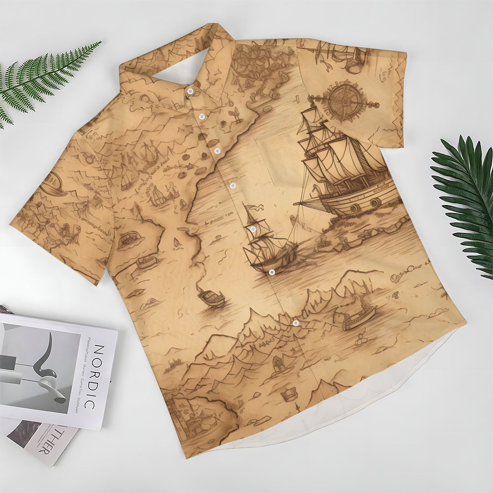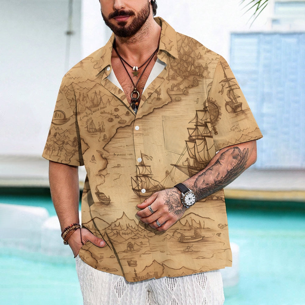Vintage Sailing Sailboat Print Chest Pocket Short Sleeve Shirt 2411005966
