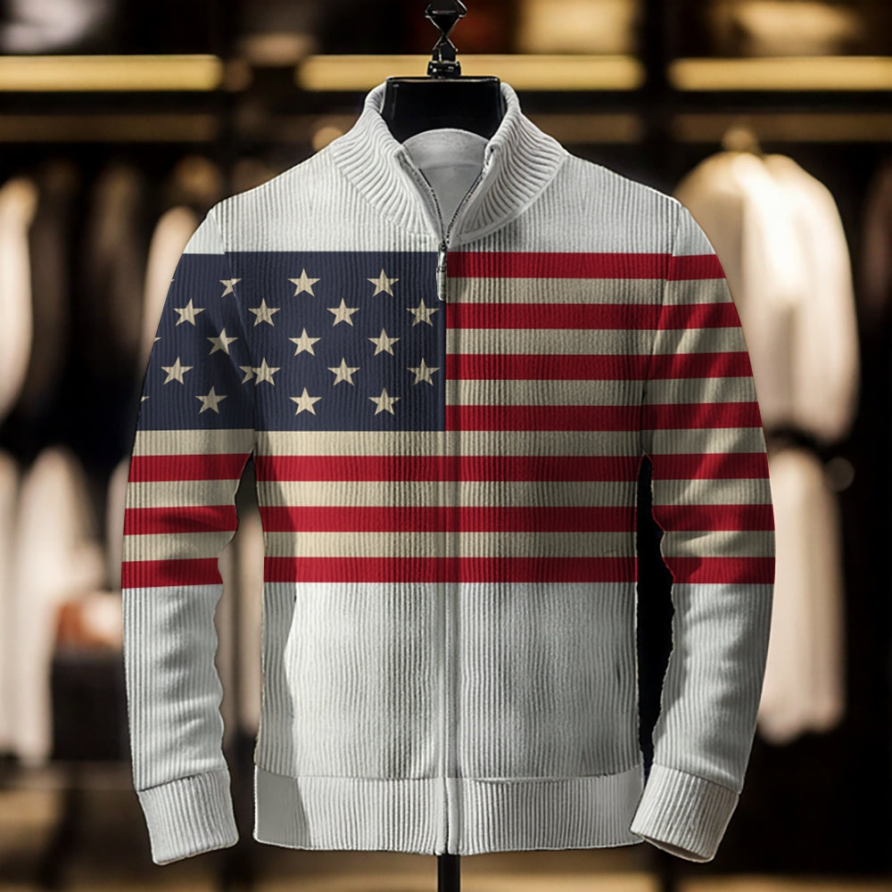 Vintage USA Flag Patriotic Art Print Knit Stand Collar Zip Up Jacket 2411011322