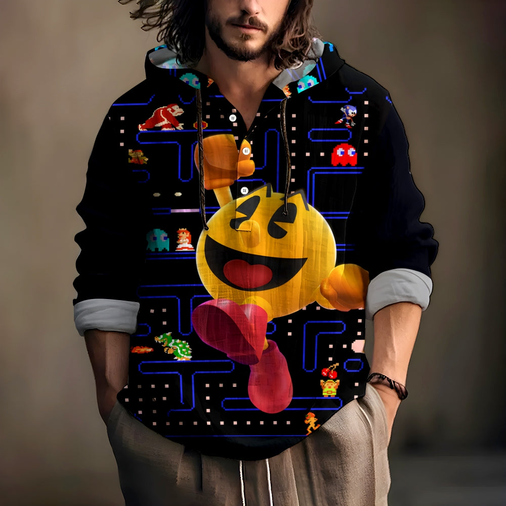 Men's Greedy Bean Print Casual Hooded long-sleeved shirt