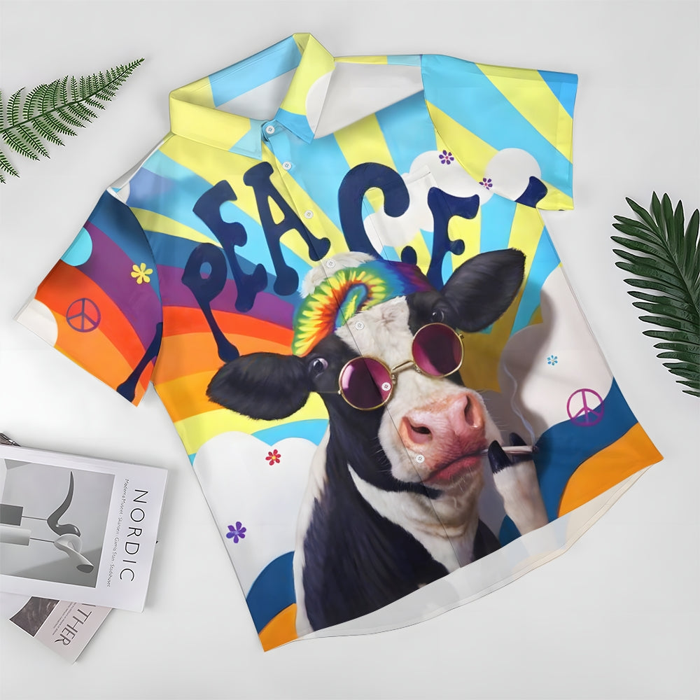 Peaceful Cow Art Print Casual Short Sleeve Shirt 2412009551