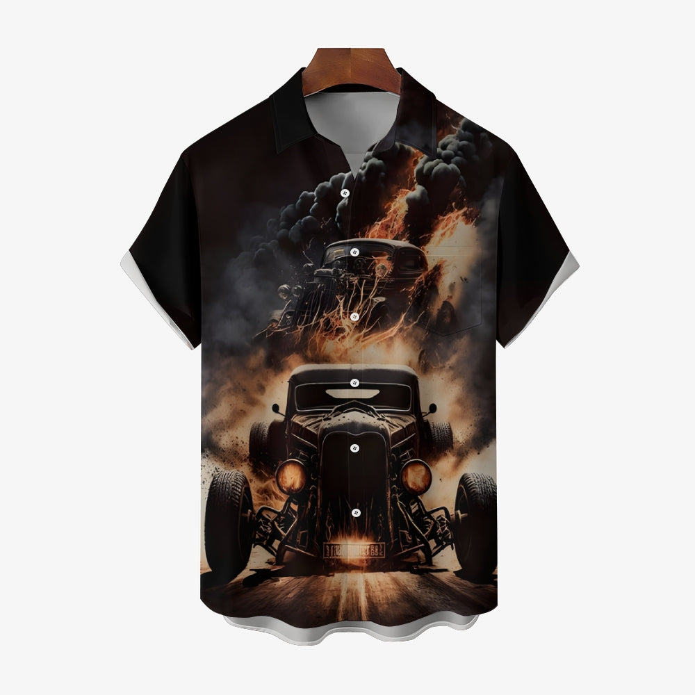 Retro Flame Muscle Car Chest Pocket Short Sleeve Casual Shirt