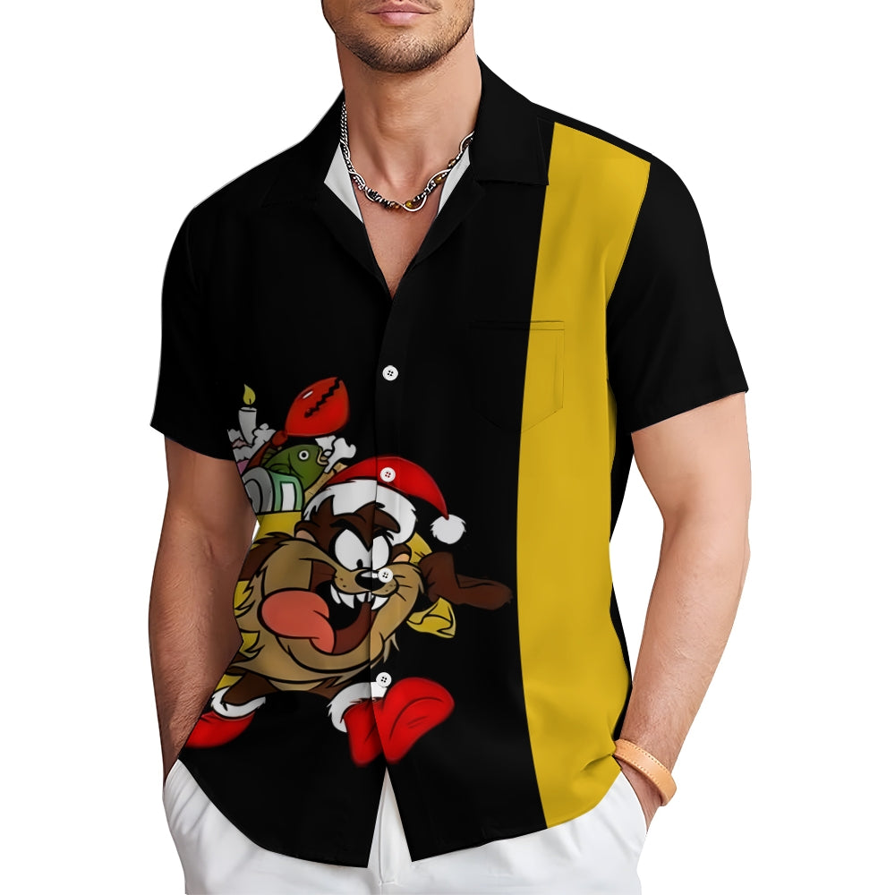 Cartoon Character Christmas Gift Print Chest Pocket Short Sleeve Shirt 2410007970