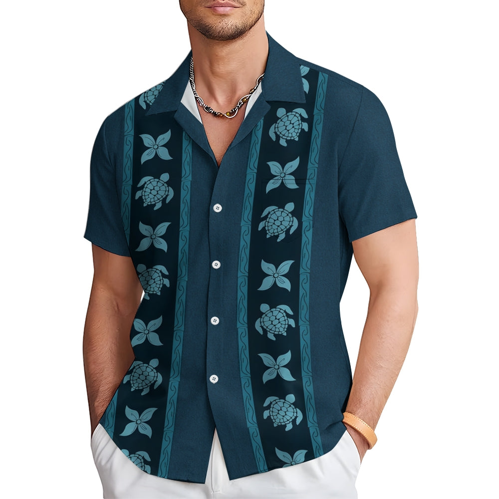 Retro Sea Turtles Floral Bowling Print Textured Men's Button Pocket Shirt 2412008338