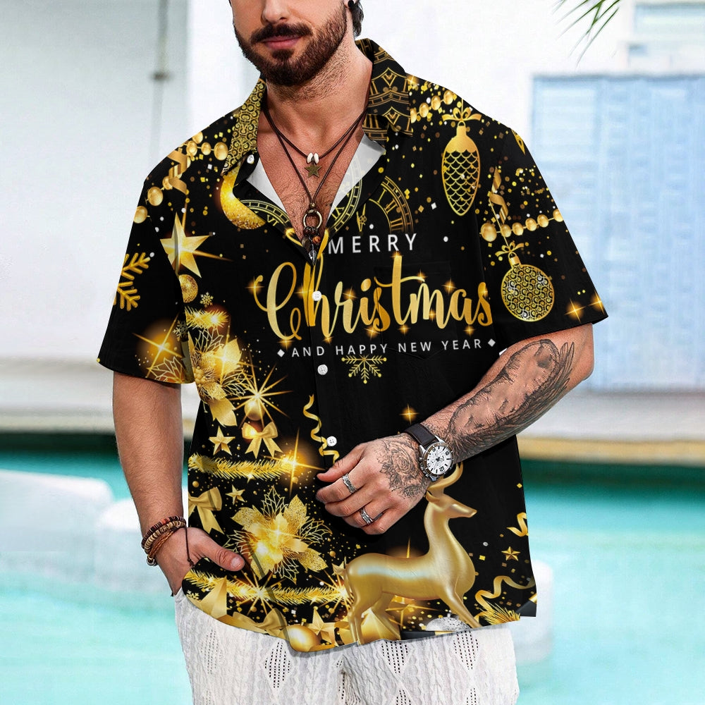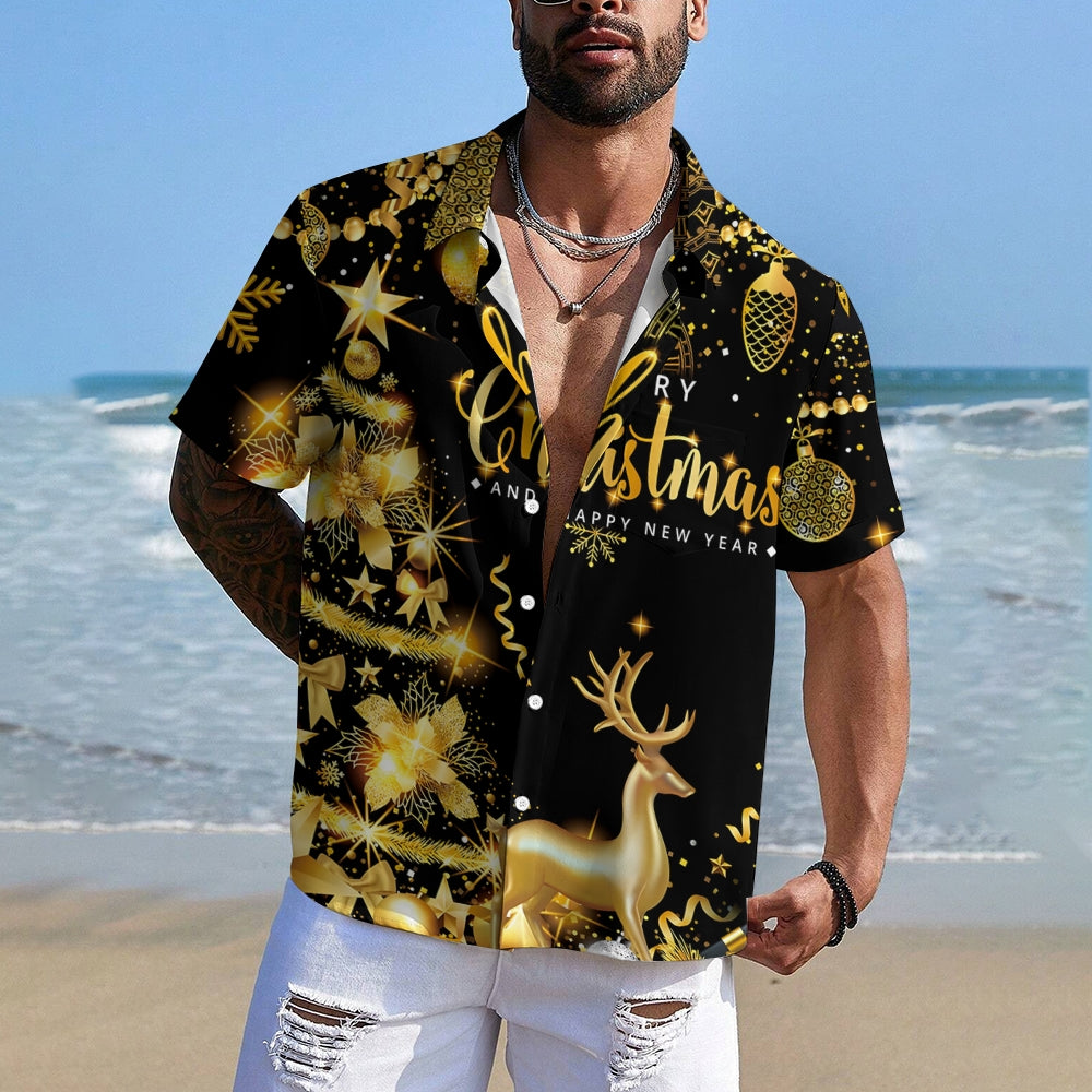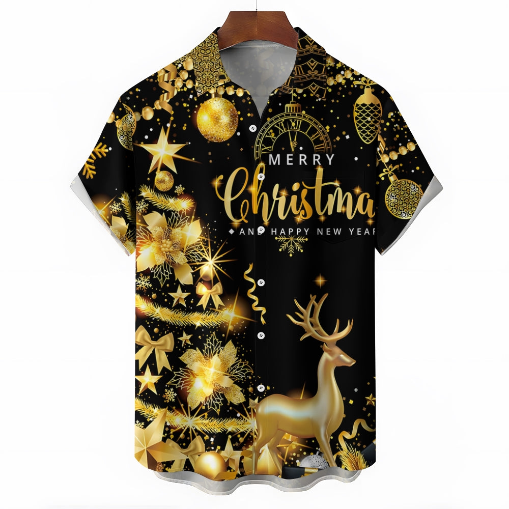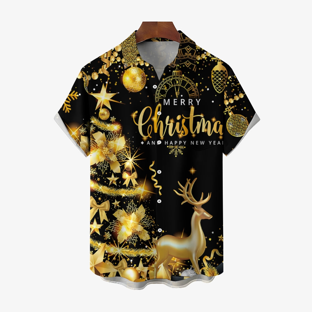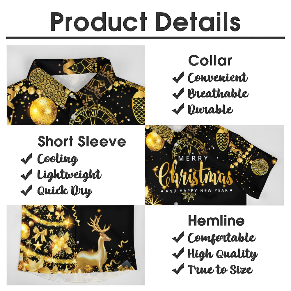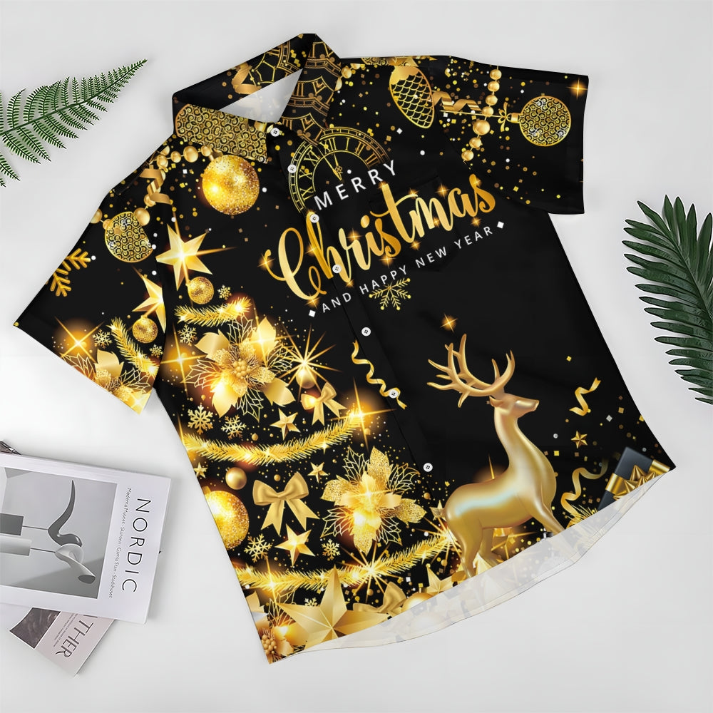 Merry Christmas Gold Glittering Elk Short Sleeve Shirt 2409004956
