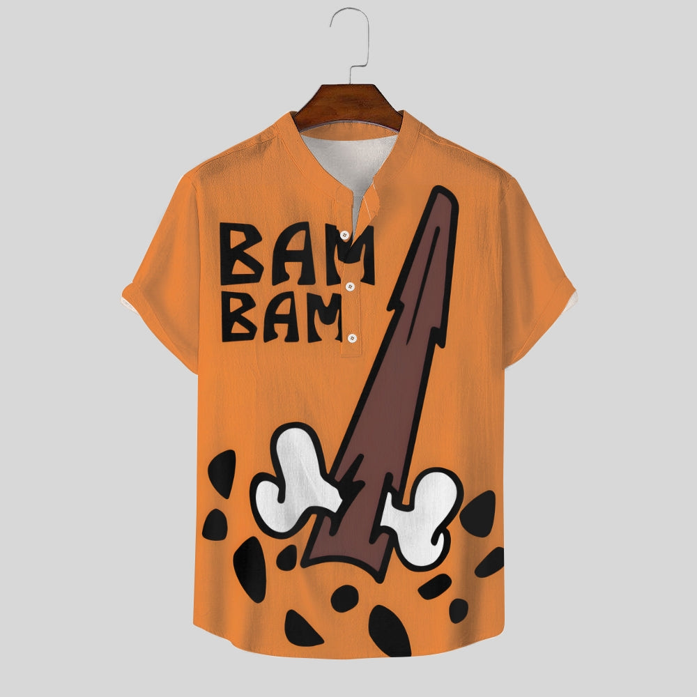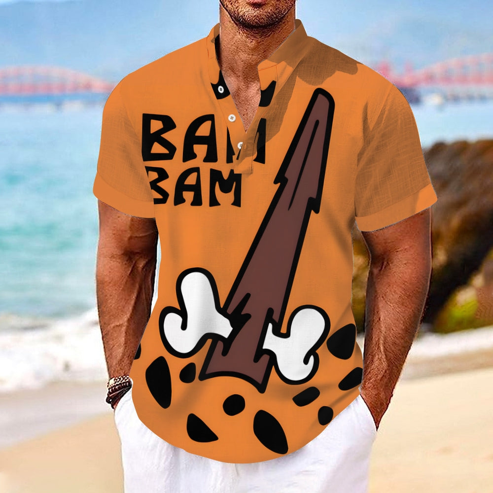 Cartoon Character Cotton And Linen Stand-Up Collar Half-Lapel Short-Sleeved Shirt 2405001035