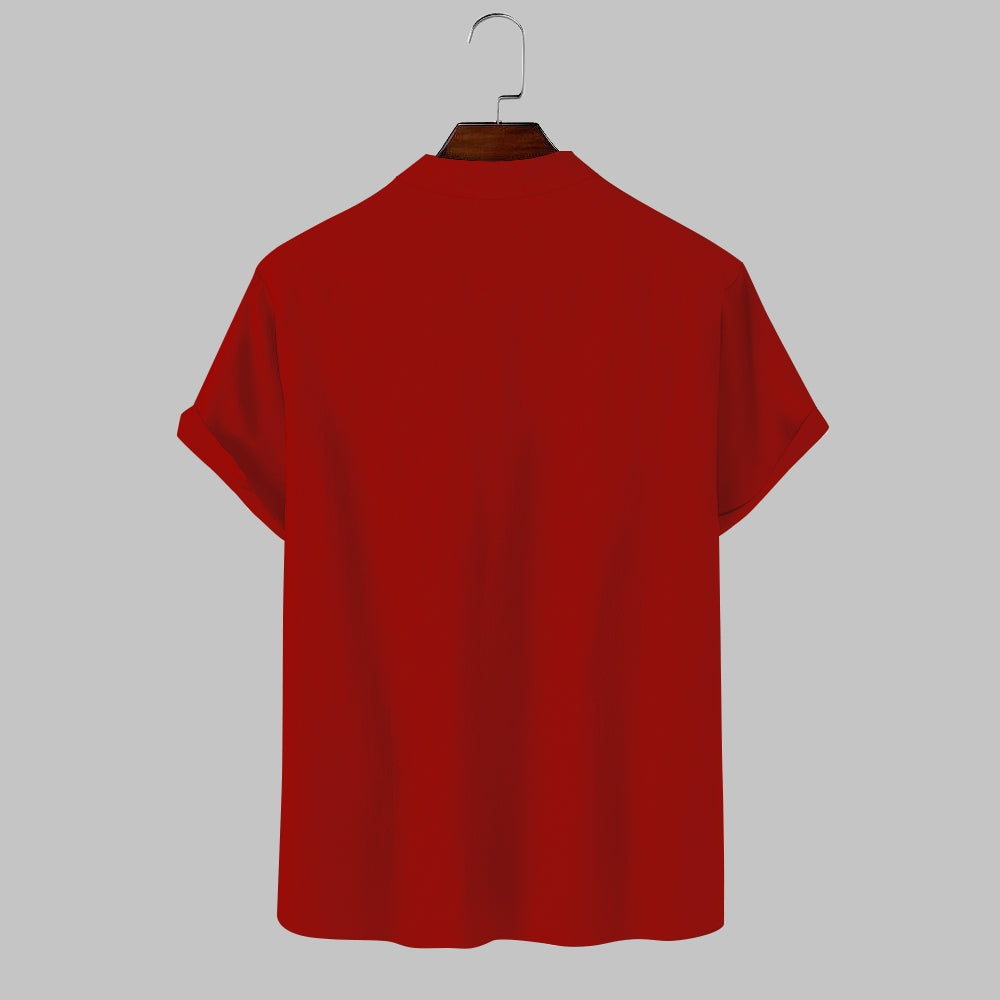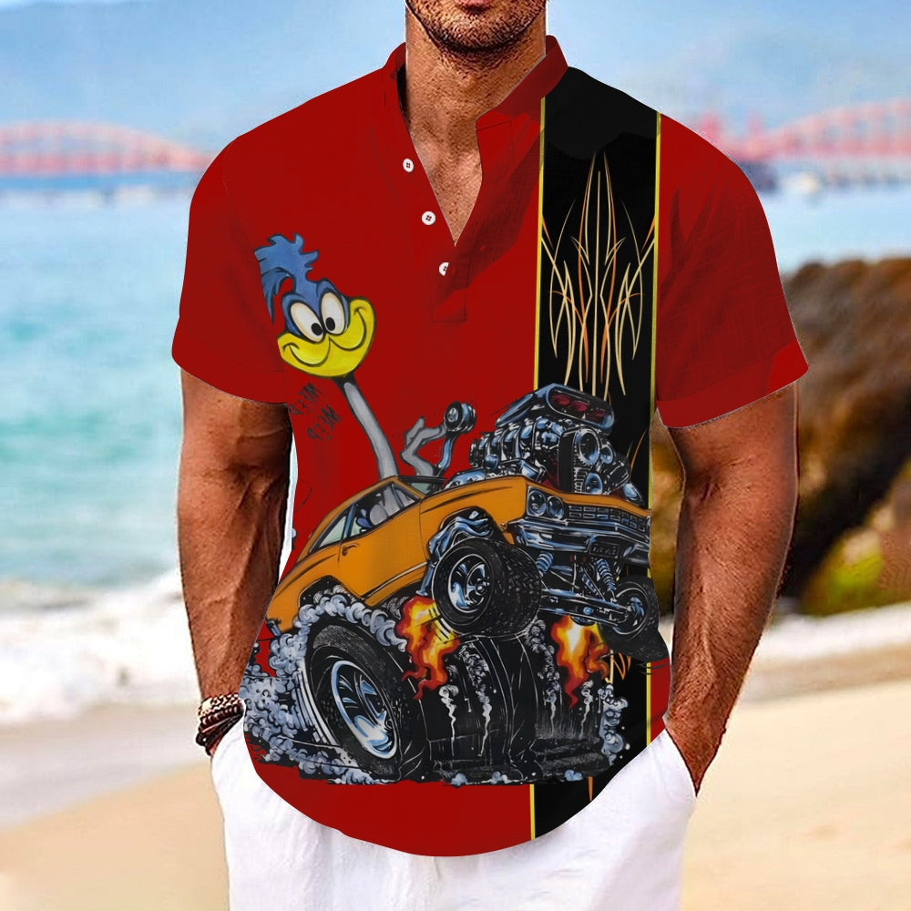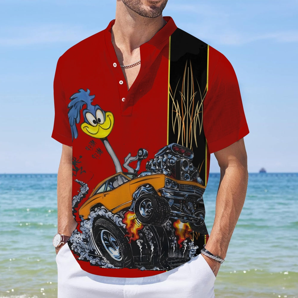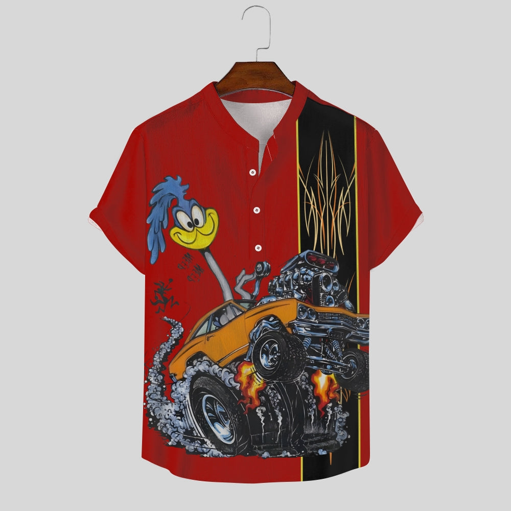 Classic Cartoon Modified Car Printing Stand-Up Collar Half-Lapel Short-Sleeved Shirt