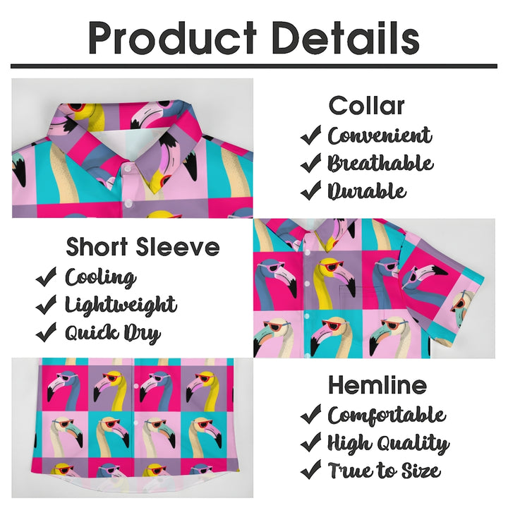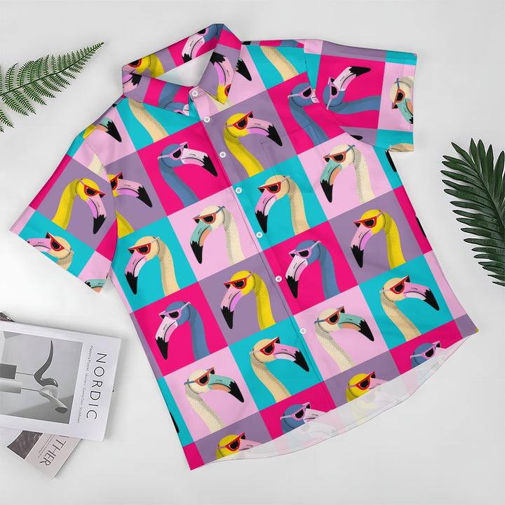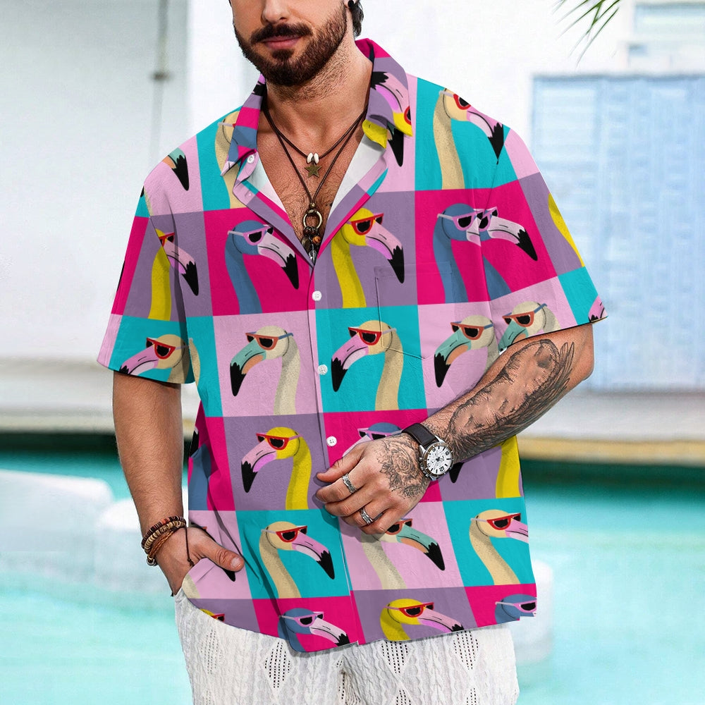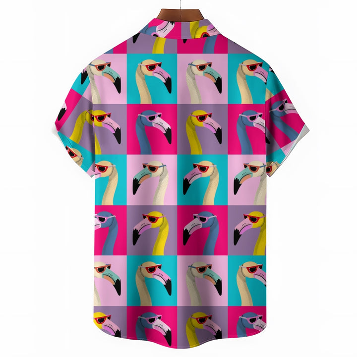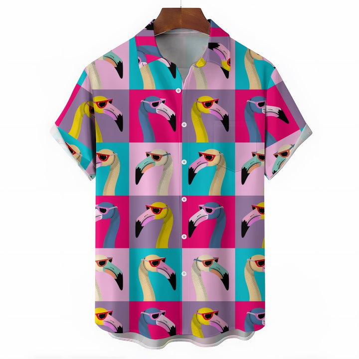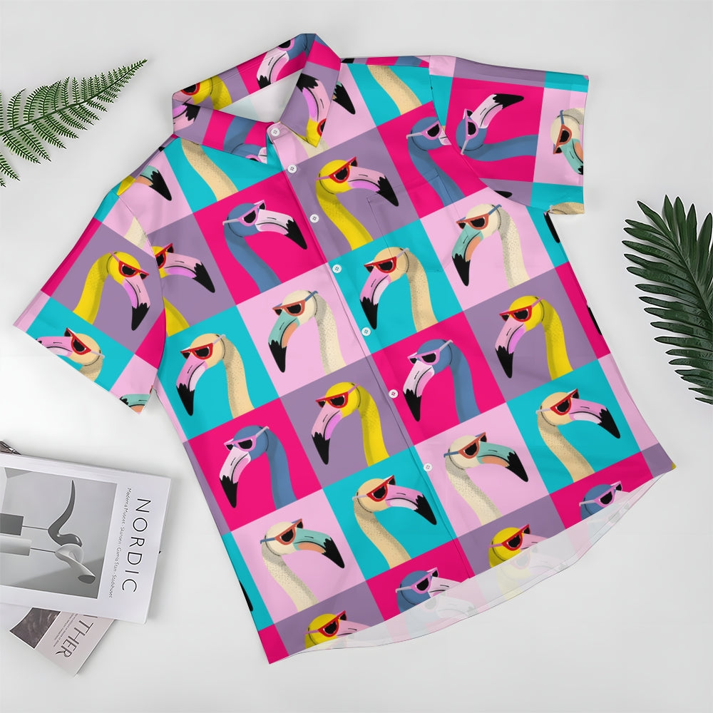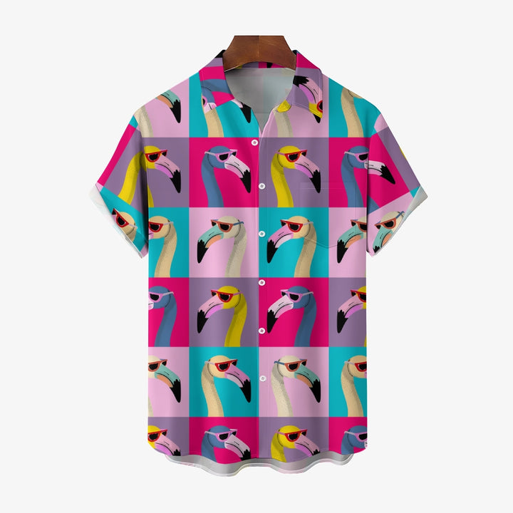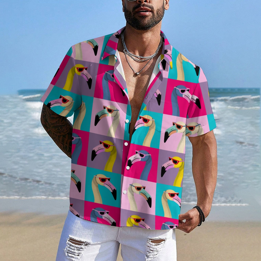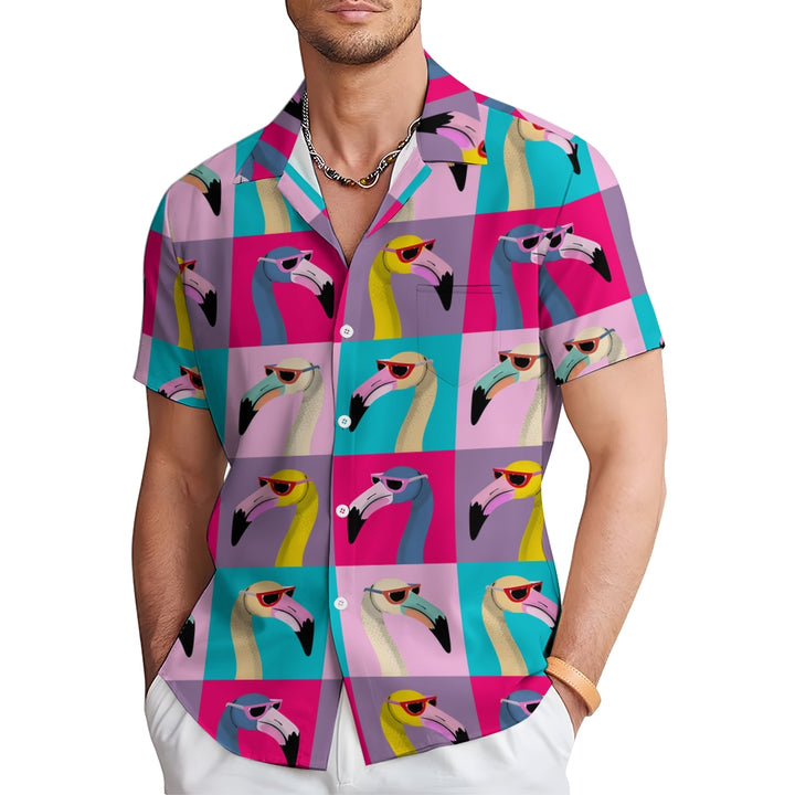 Colorblock Flamingo Print Slub Linen Short Sleeve Shirt 2408006209