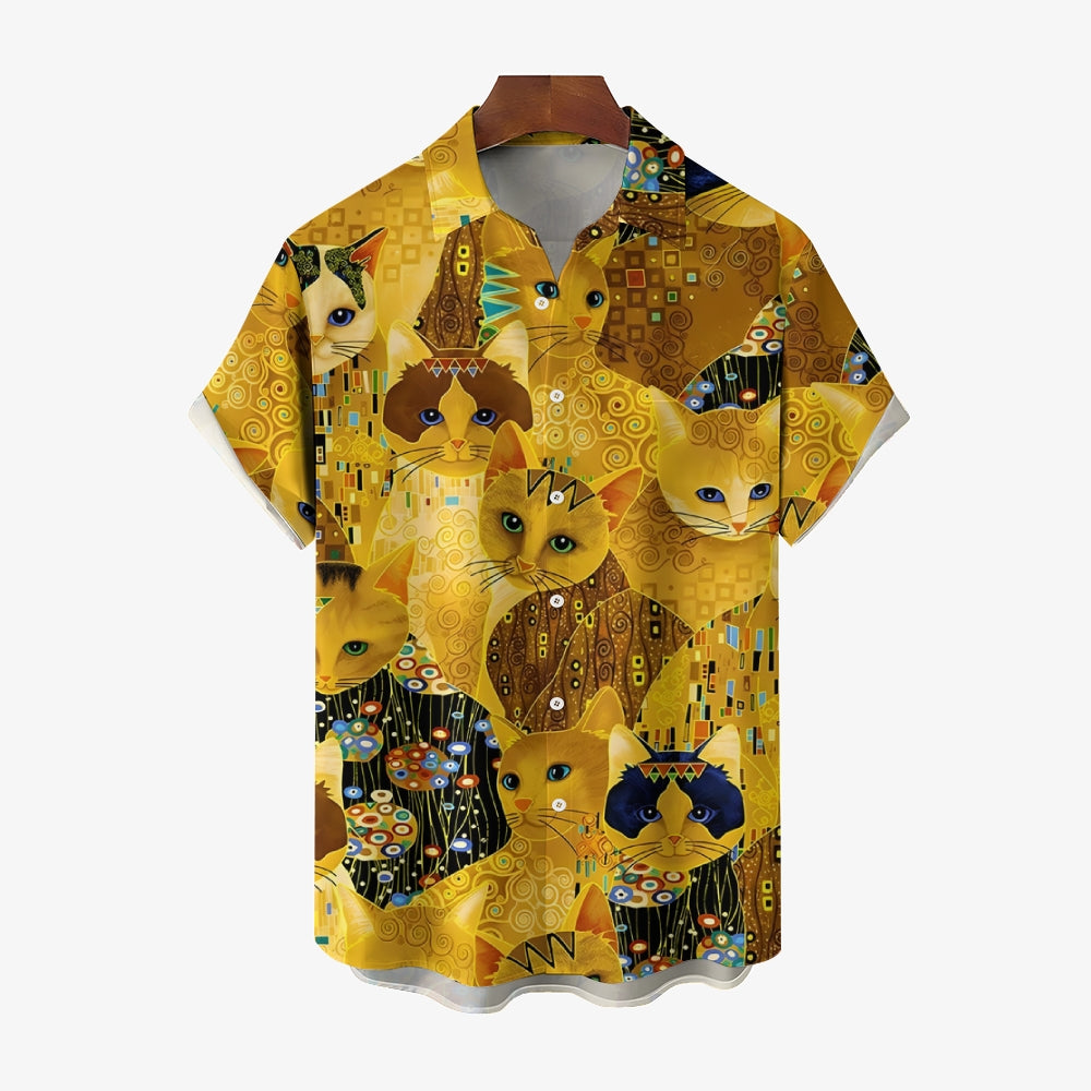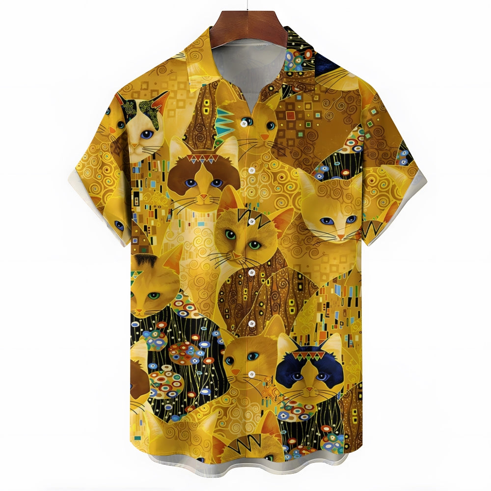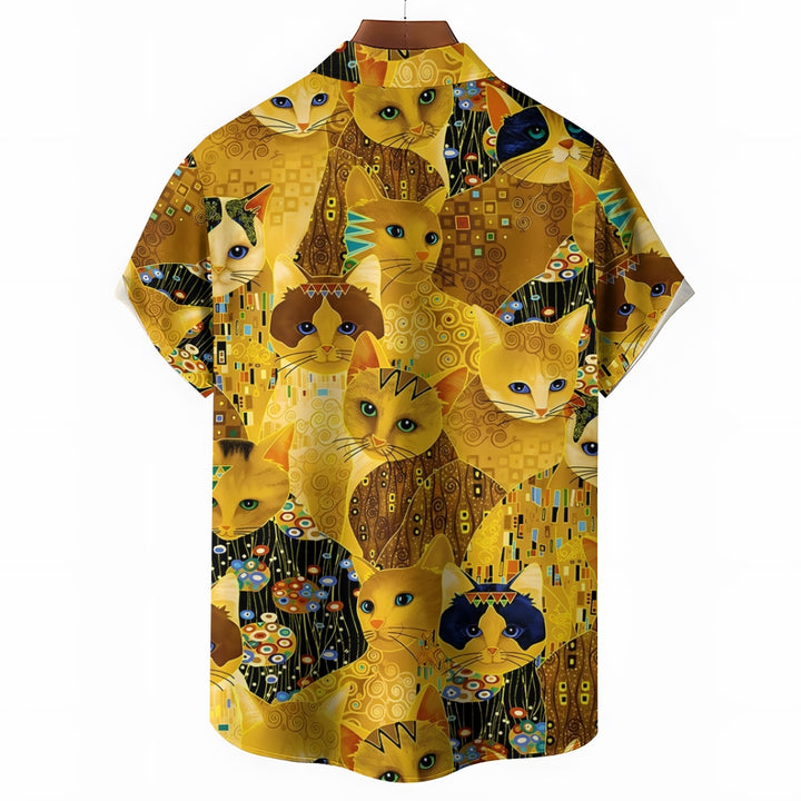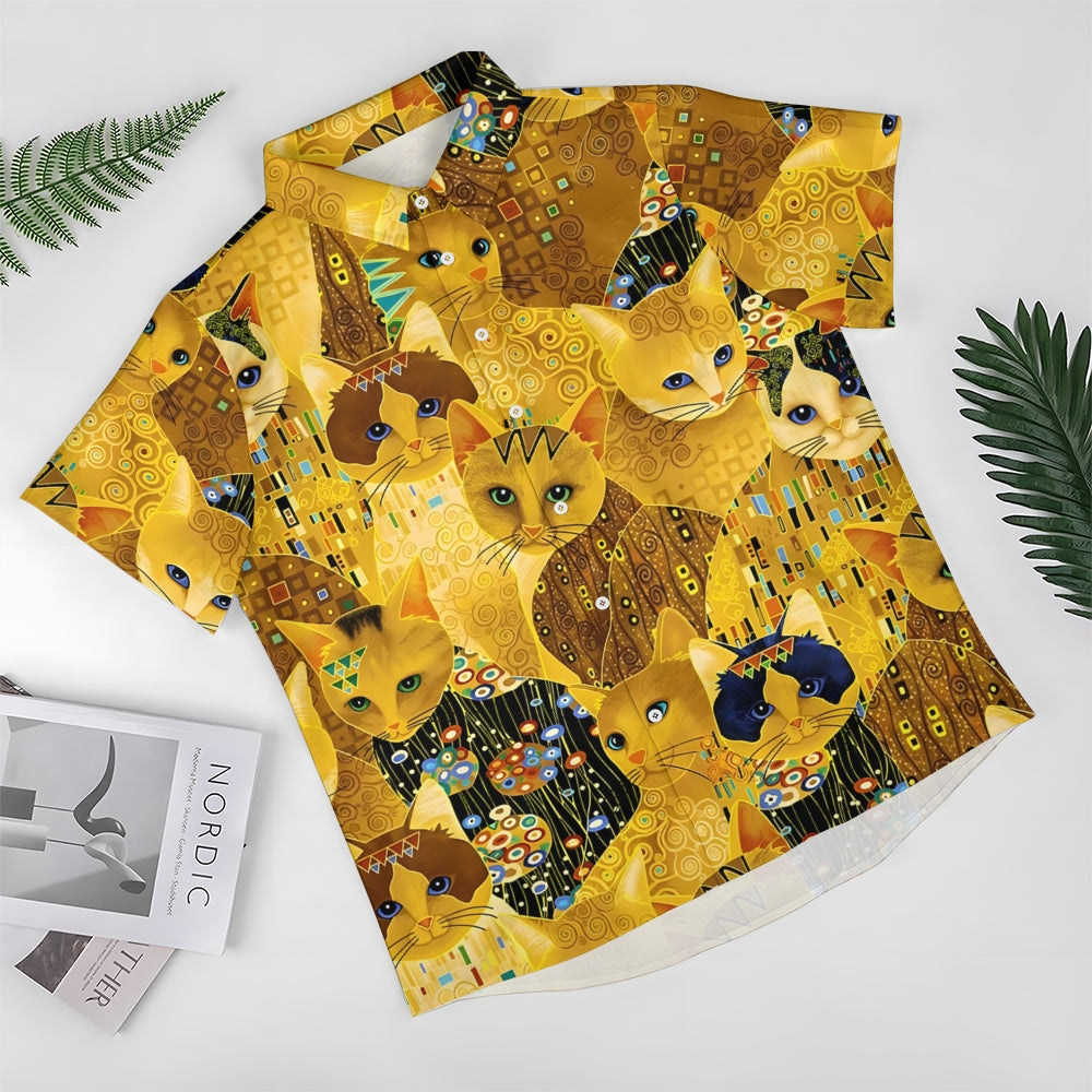 Gold Cat Print Casual Oversized Short Sleeve Shirt 2407005204