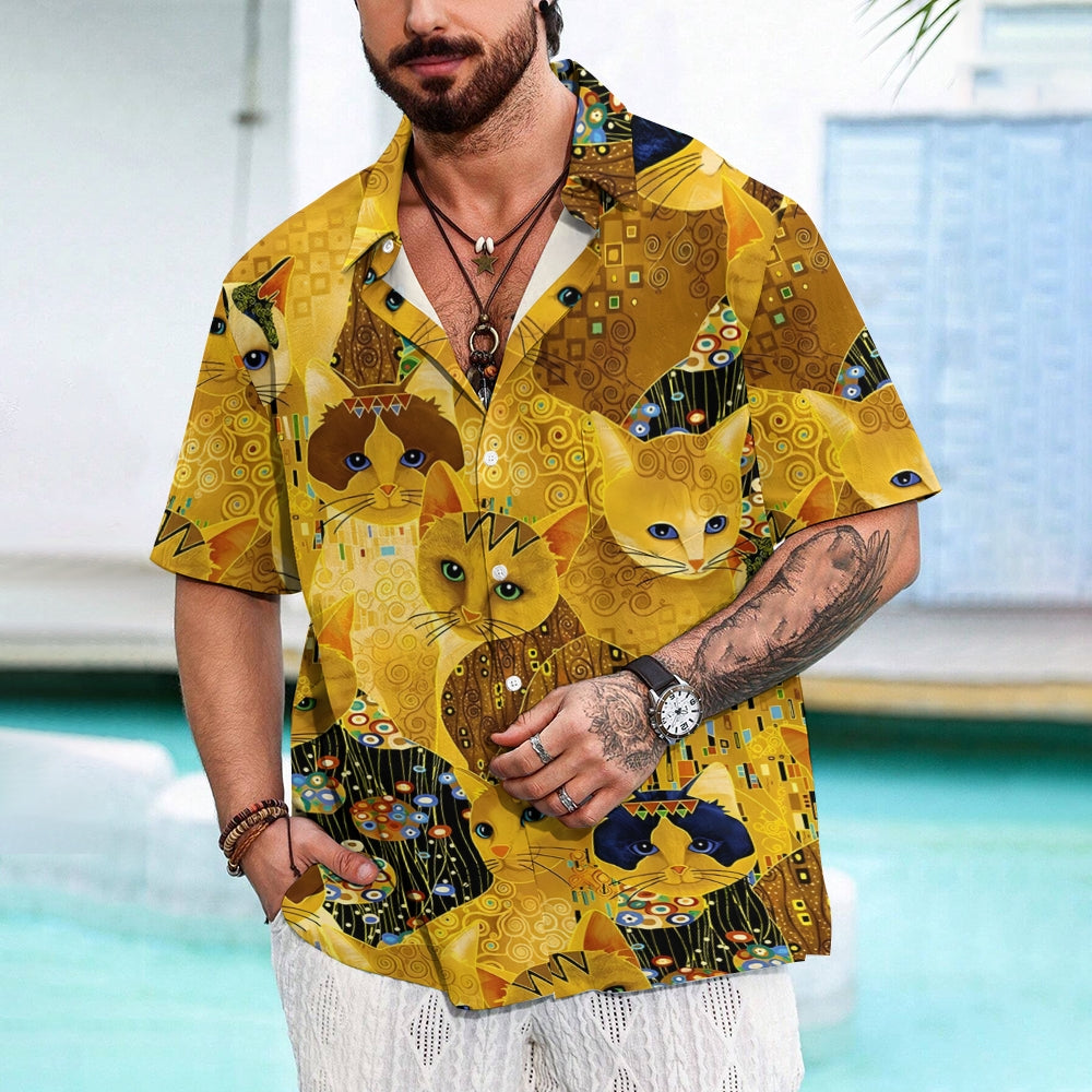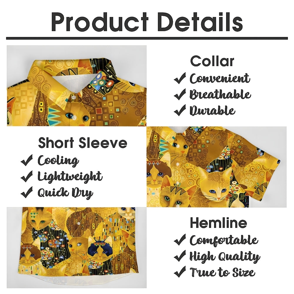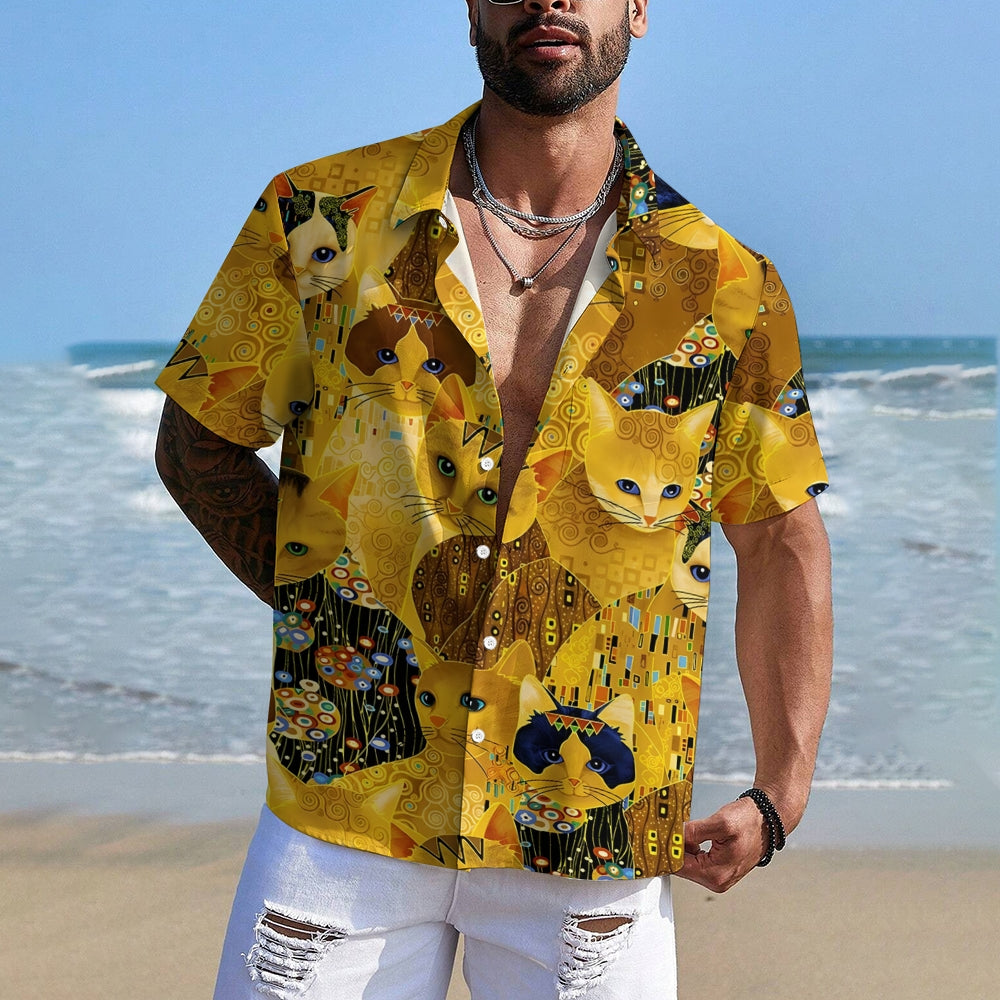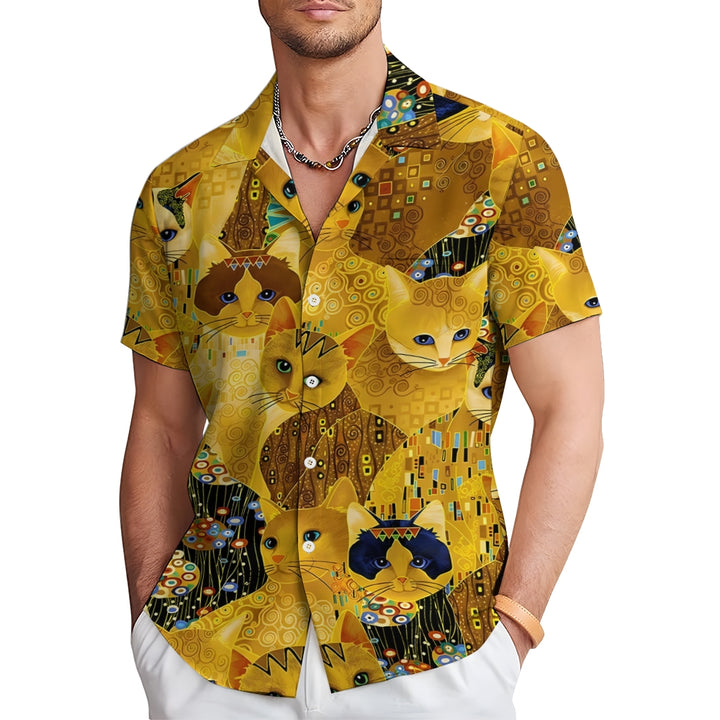 Gold Cat Print Casual Oversized Short Sleeve Shirt 2407005204