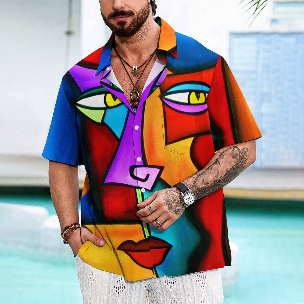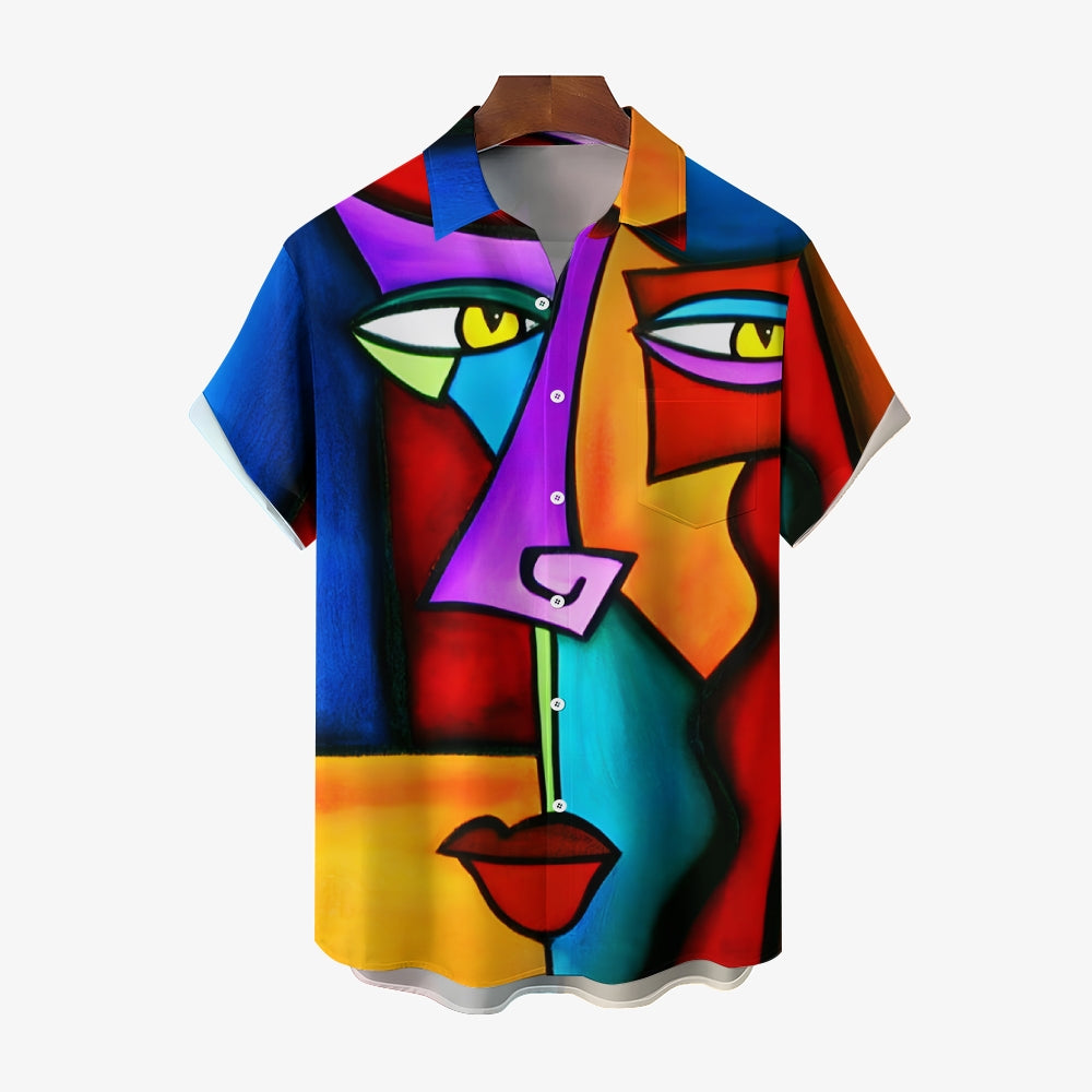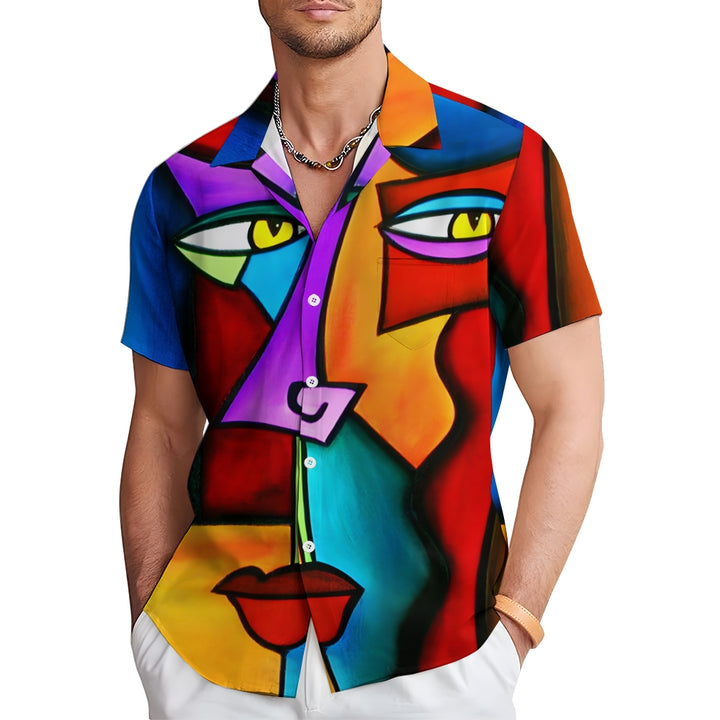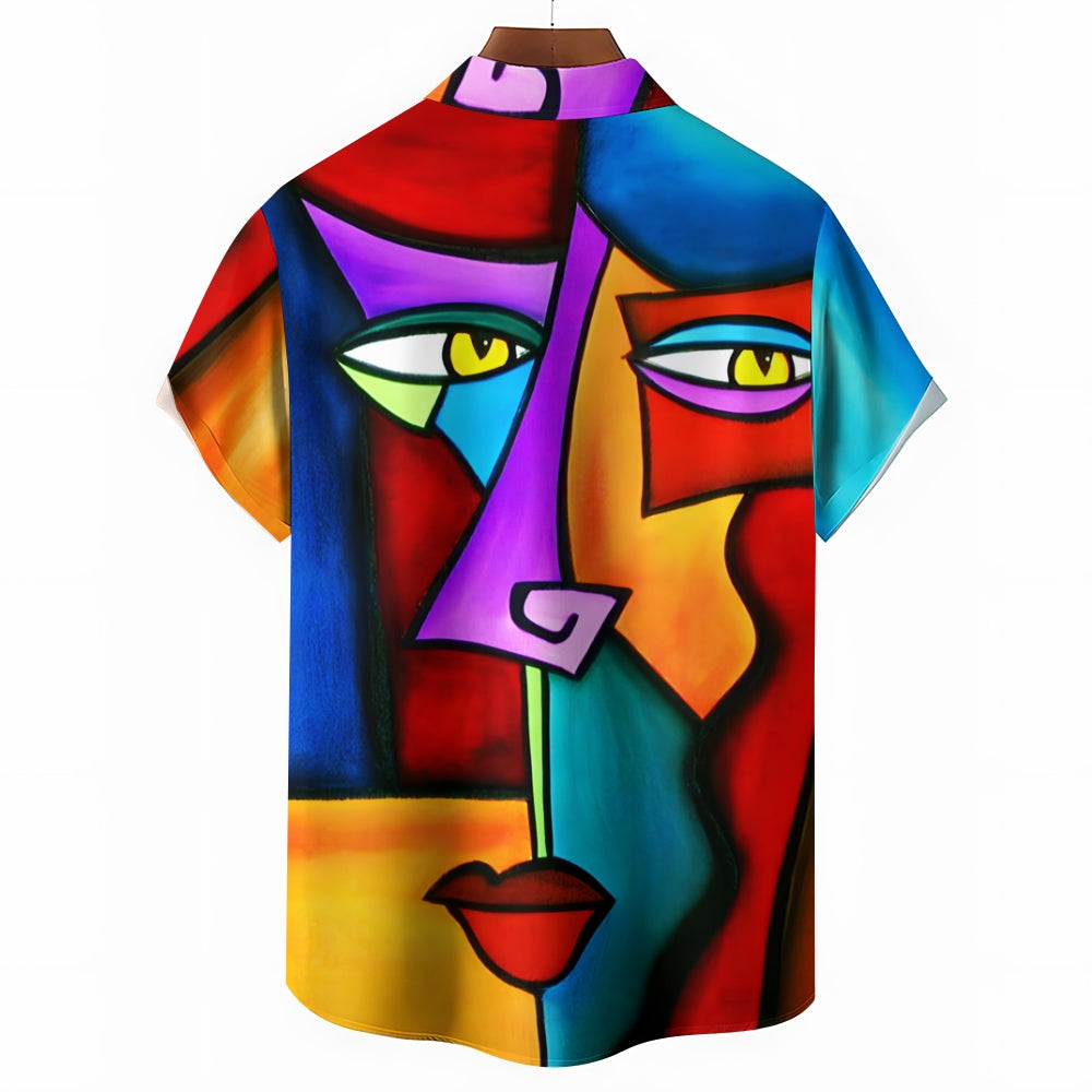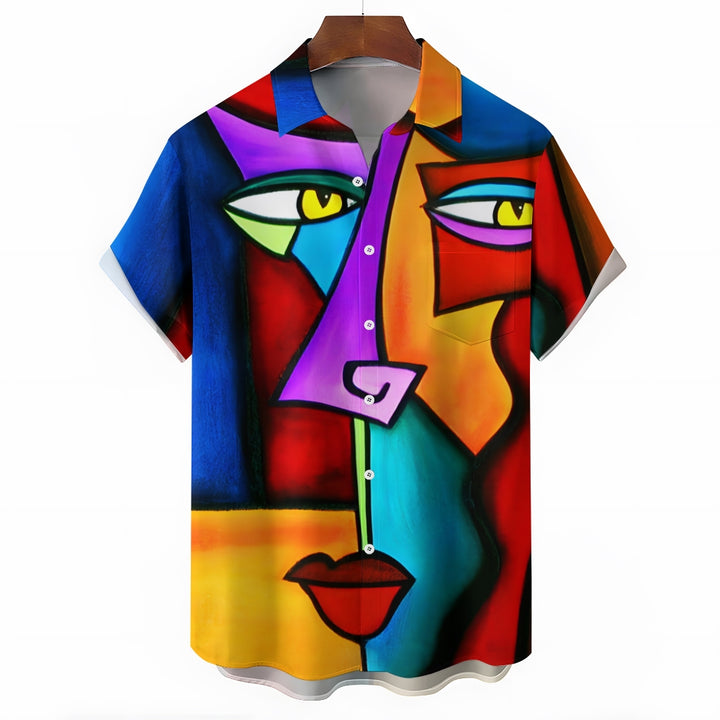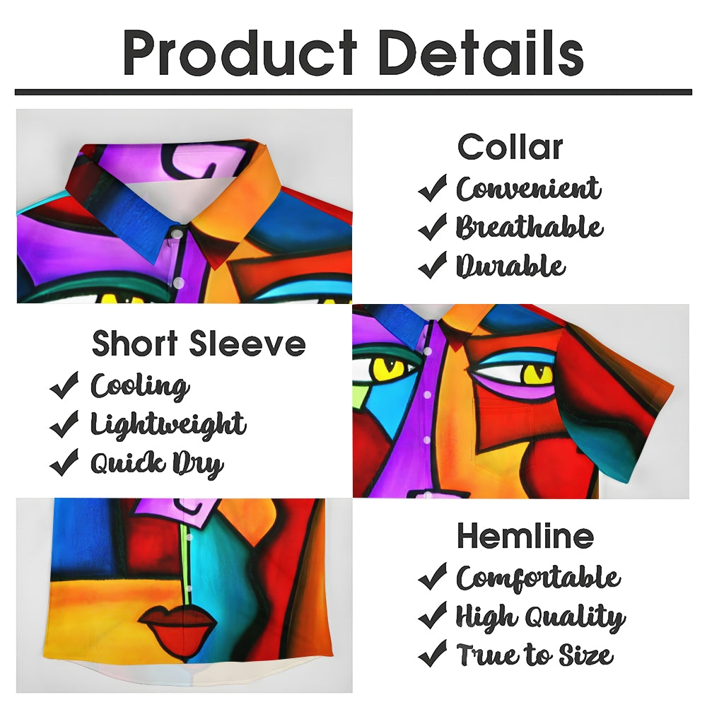Geometric Abstract Art Print Large Slub Linen Short Sleeve Shirt 2407003297
