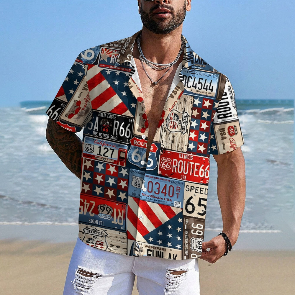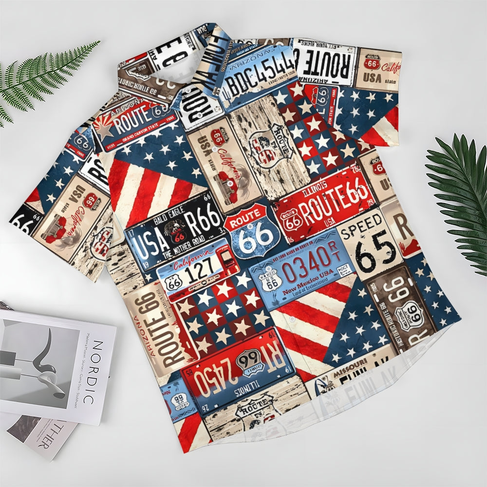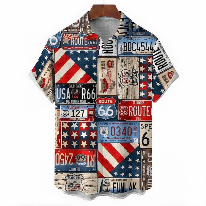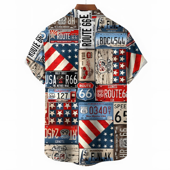 Men's American License Plate Collage Print Casual Short Sleeve Shirt 2401000105