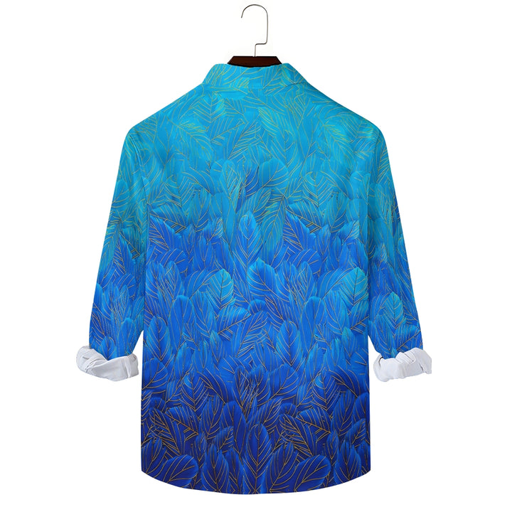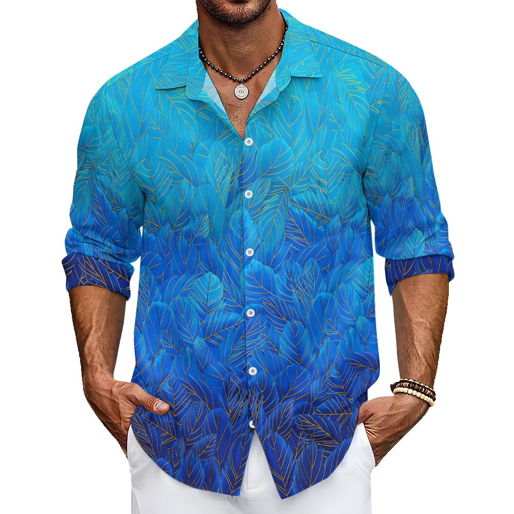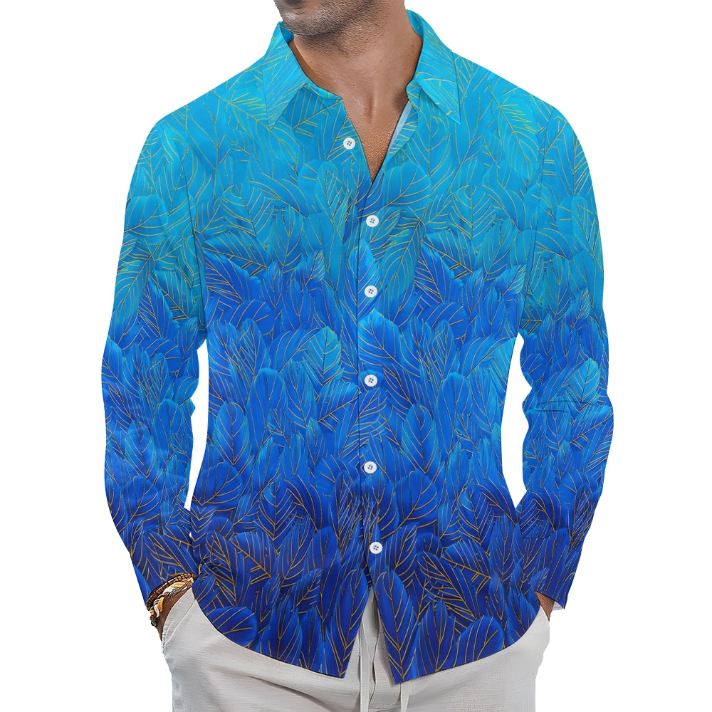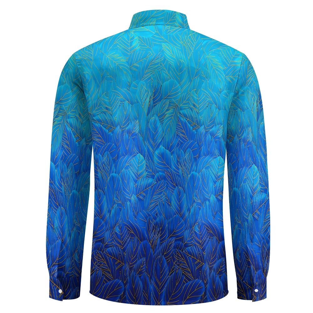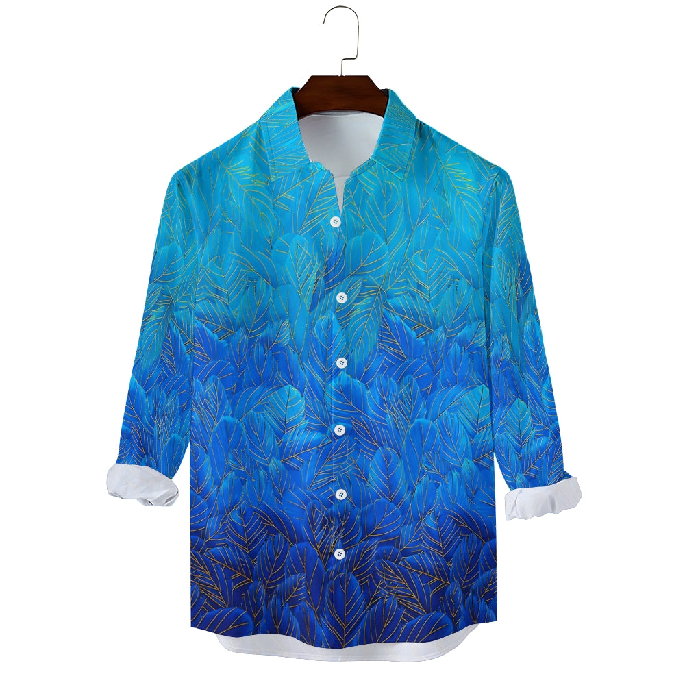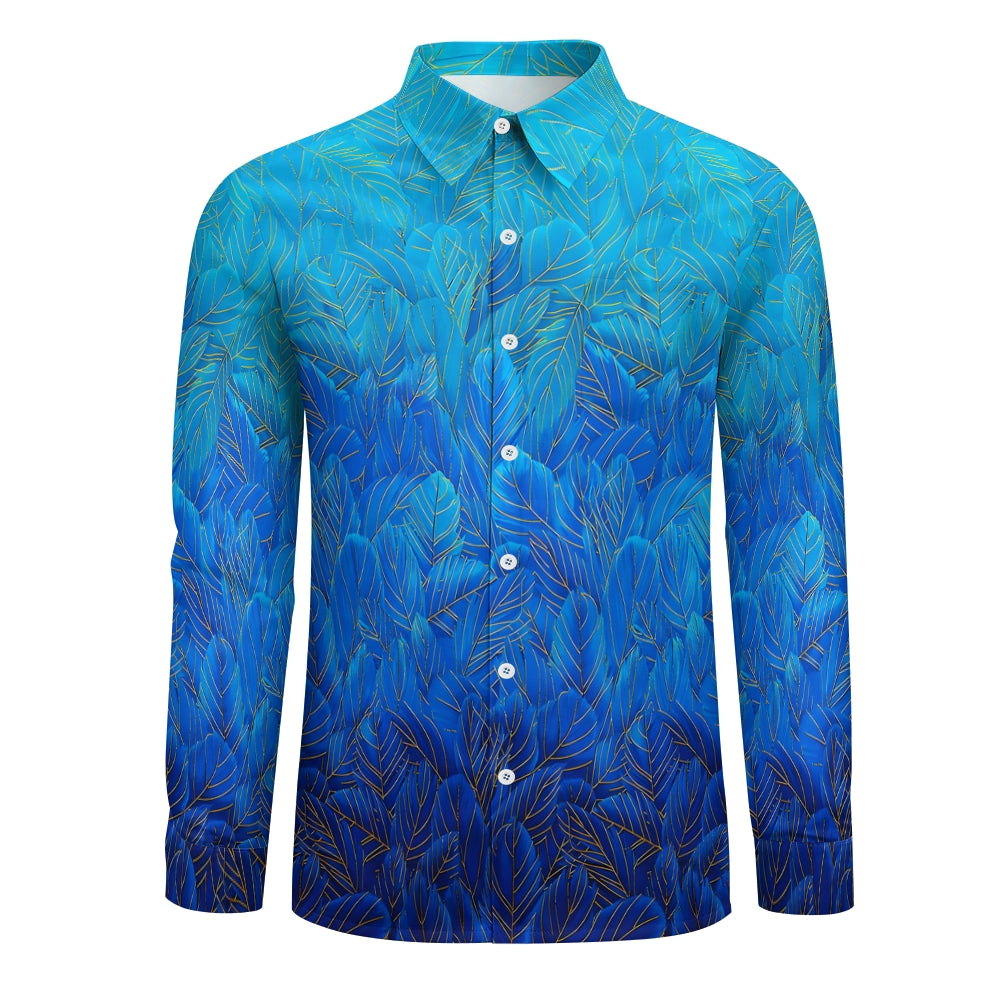 Men's Hawaiian Shirt Blue Feather Print Casual Vacation Long Sleeve Shirt 2408006346