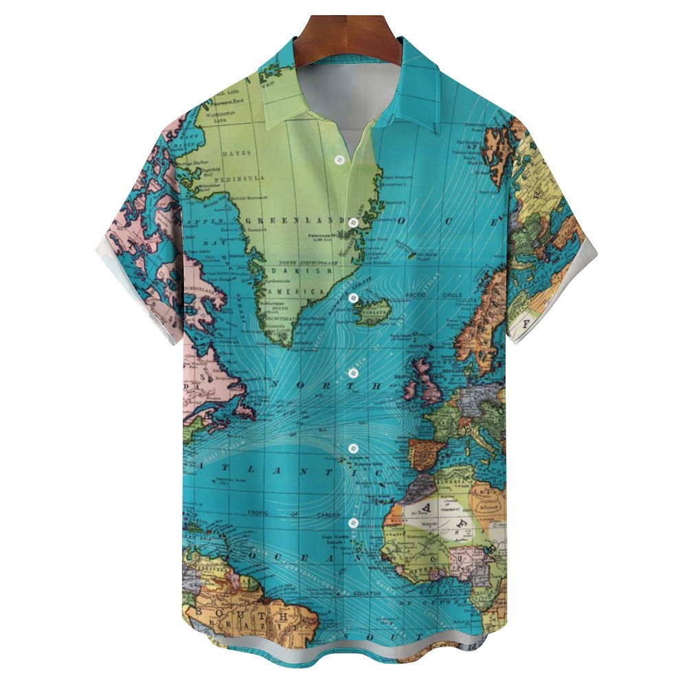 Men's World Map Breathable Casual Fashion Chest Pocket Short Sleeve Shirt 2307101611