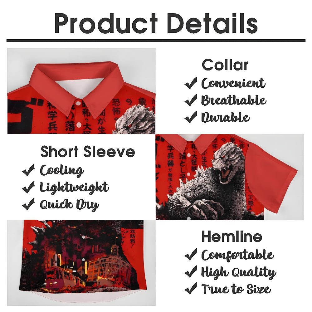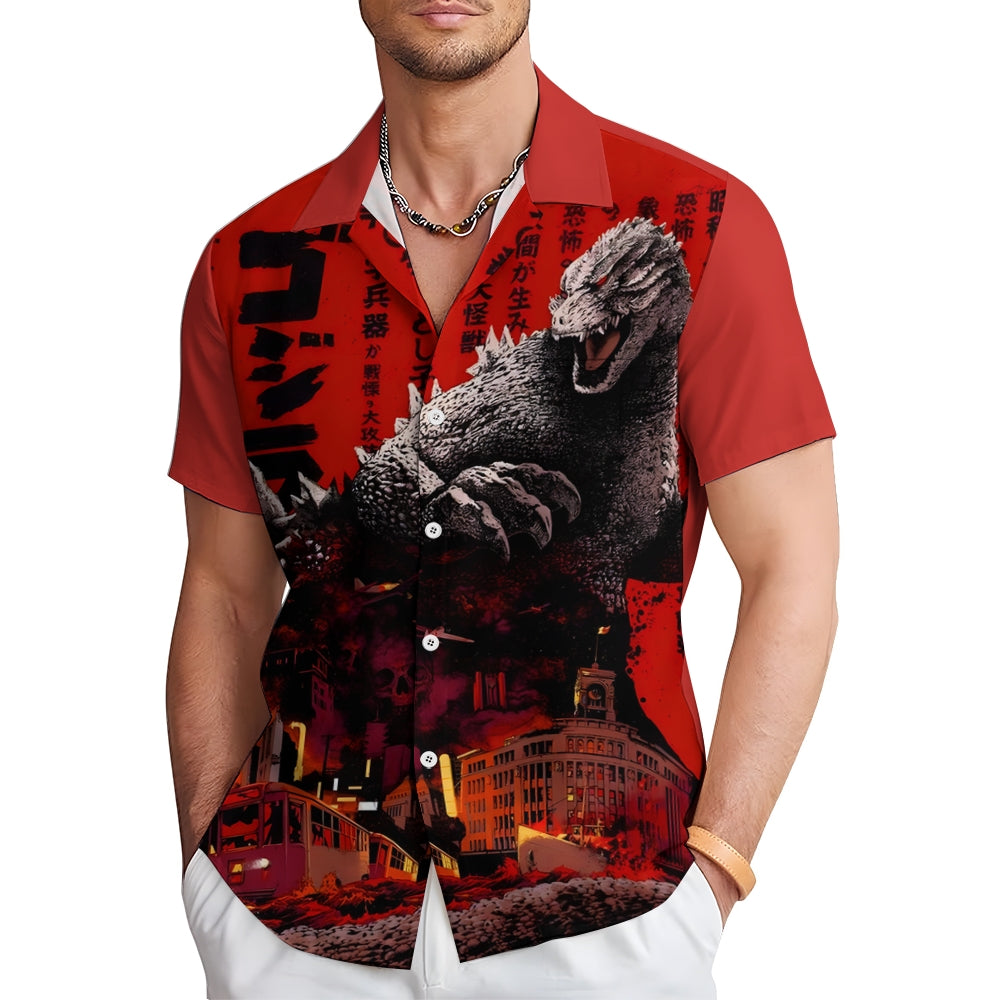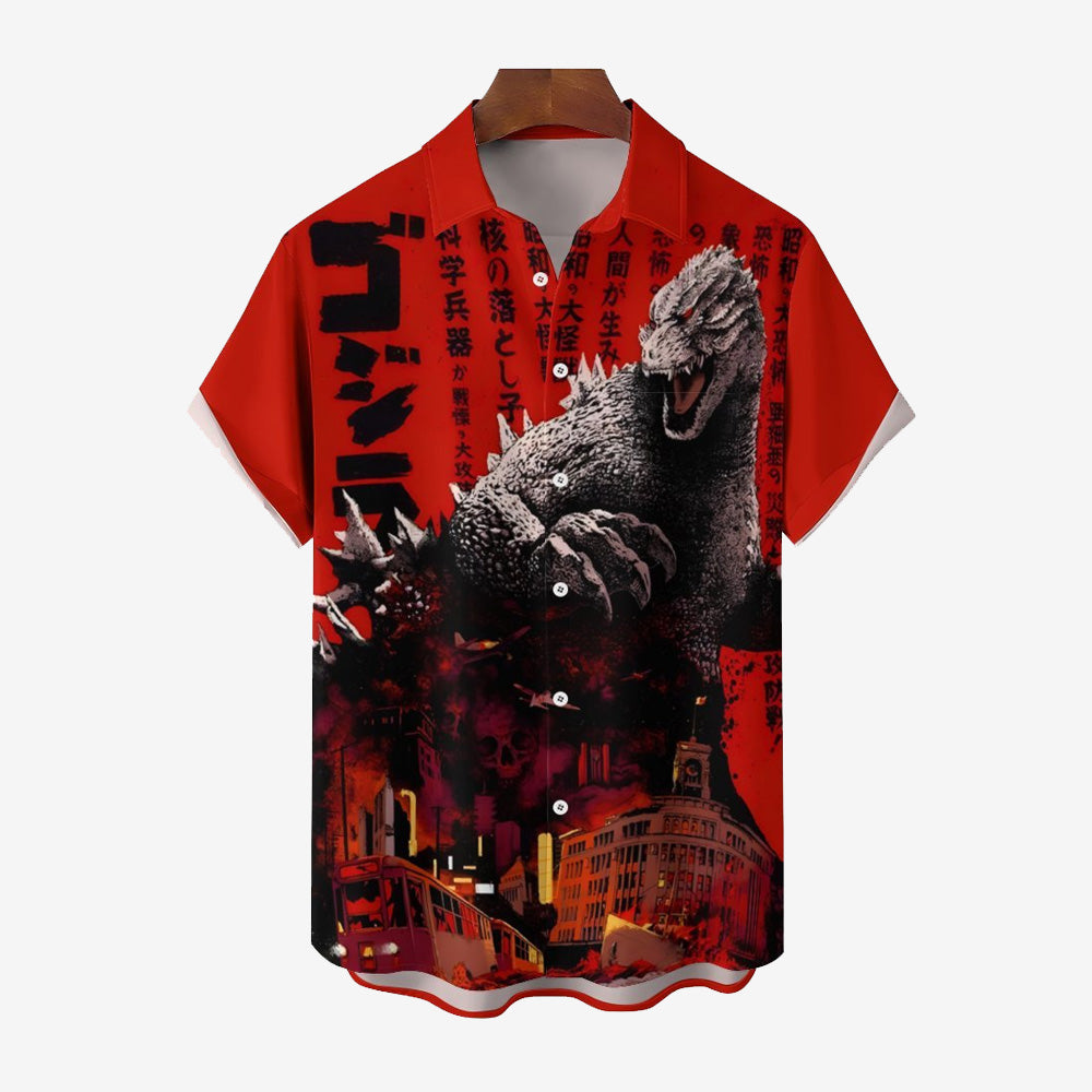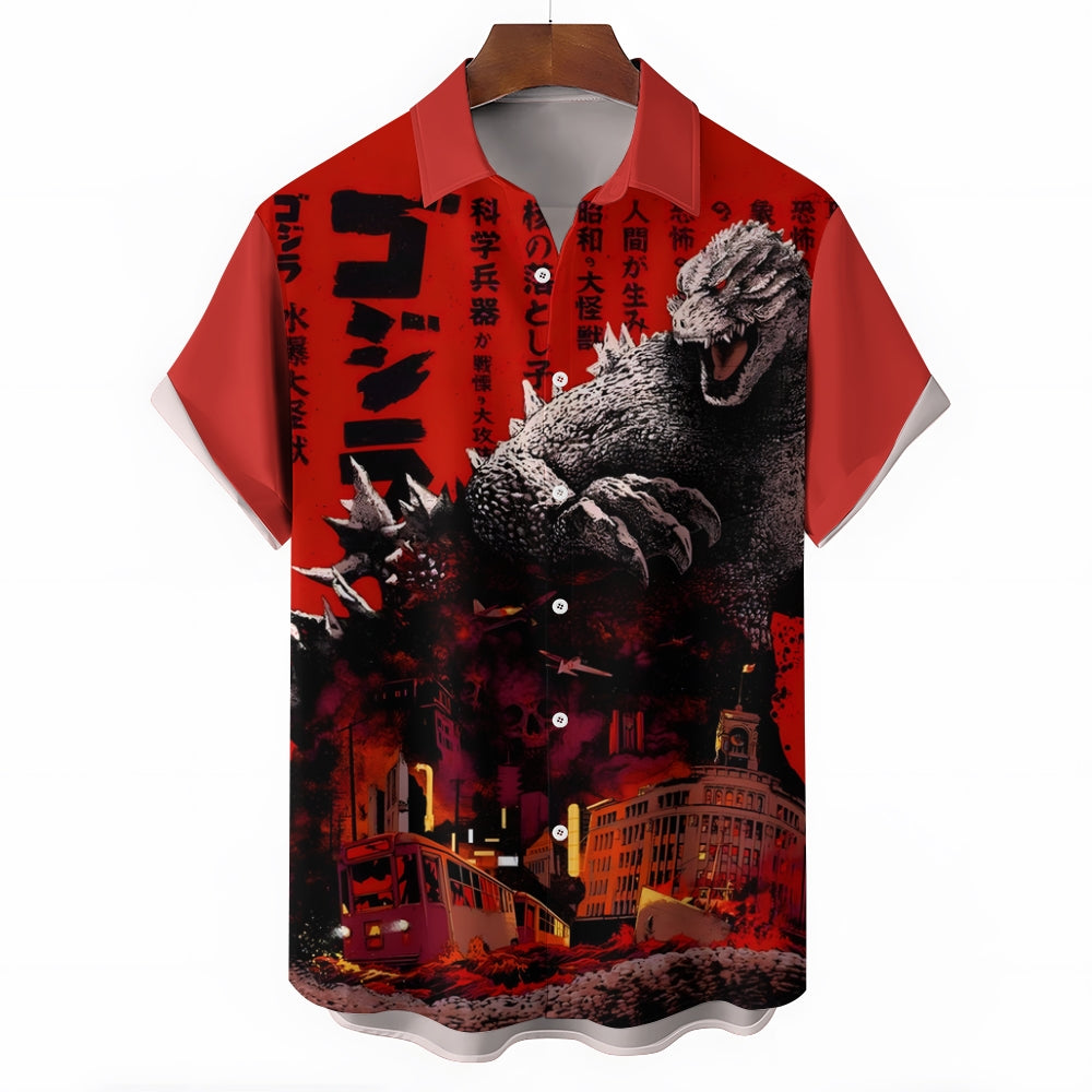 Red Giant Monster Godzilla And Cruise Ship Print Casual Short Sleeve Shirt 2402000094