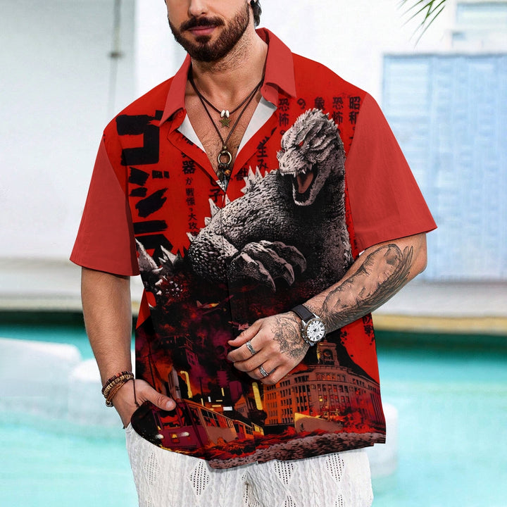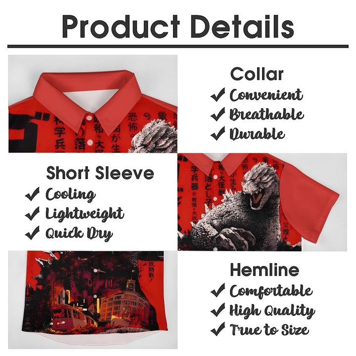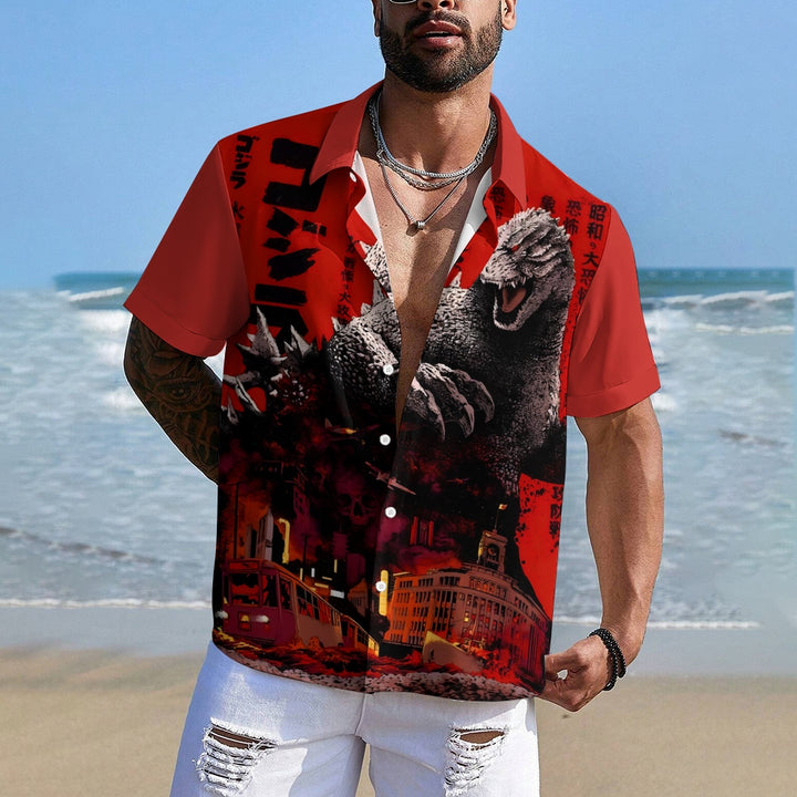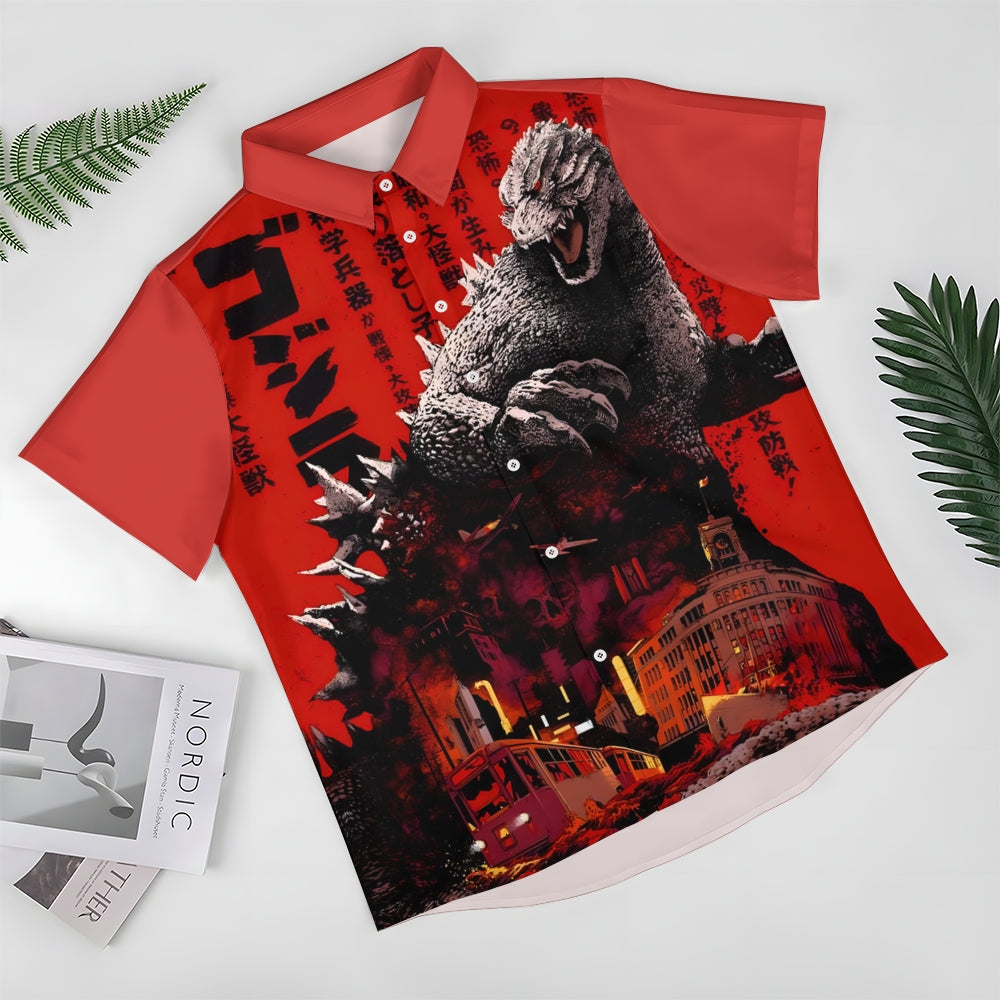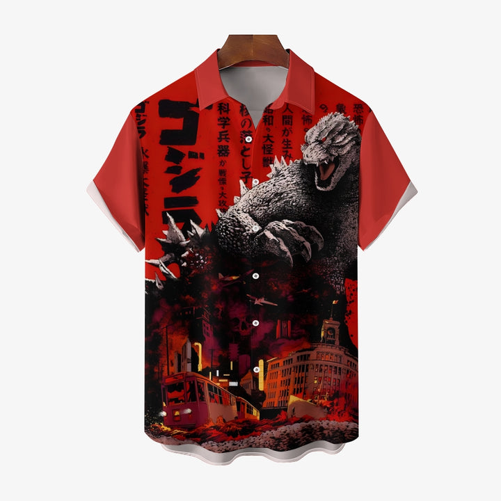 Red Giant Monster Godzilla And Cruise Ship Print Casual Short Sleeve Shirt 2402000094
