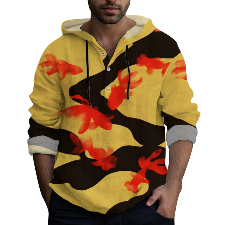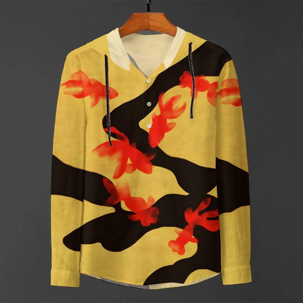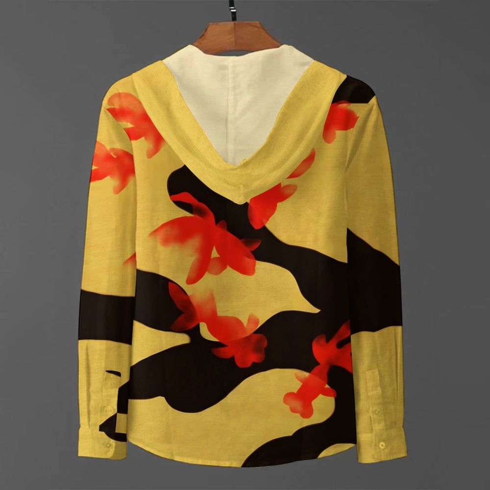 Red Goldfish Art Linen Hooded Long Sleeve Shirt 2409006322
