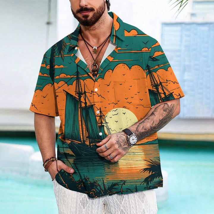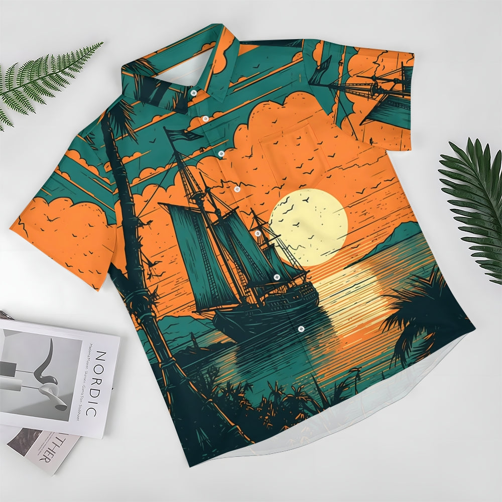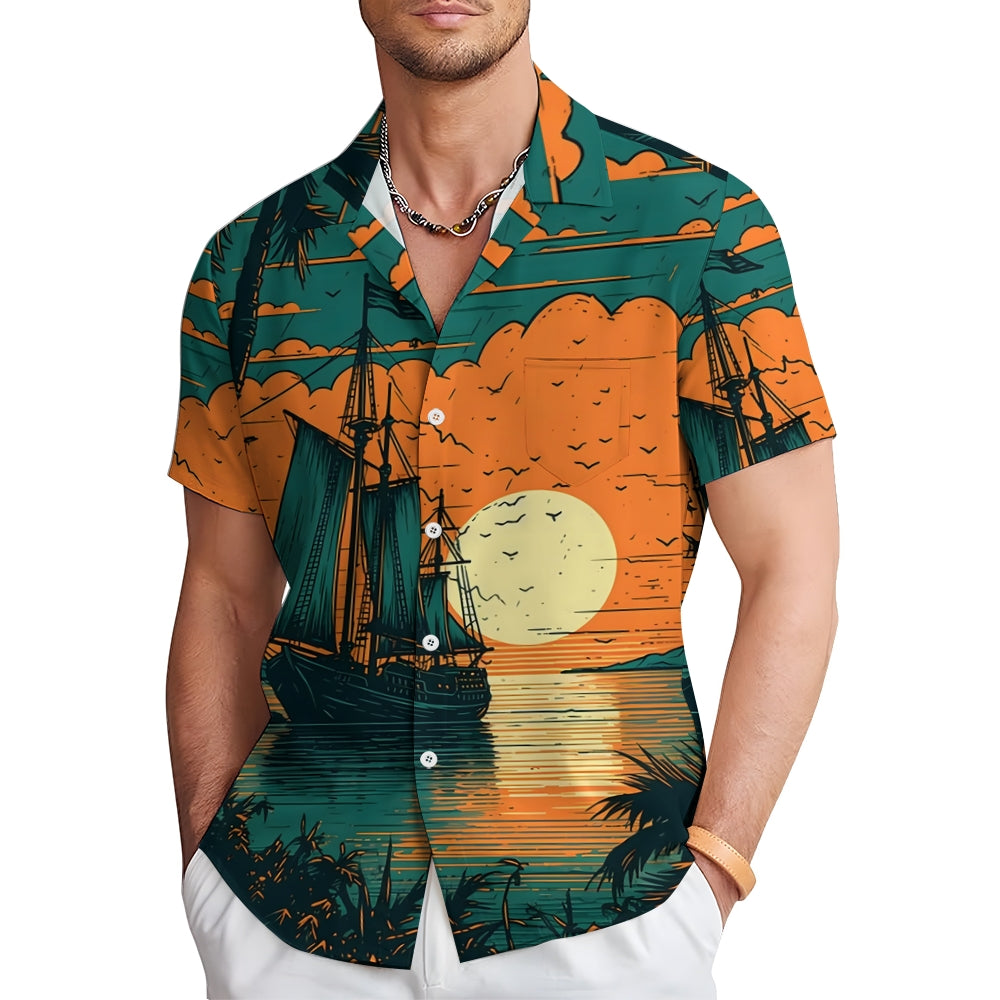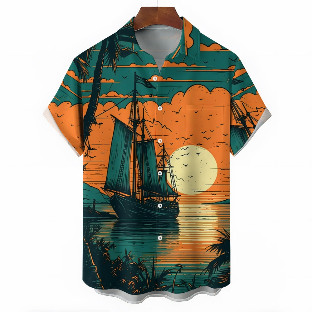 Sailing Boat On Sea Casual Short Sleeve Shirt 2405000681