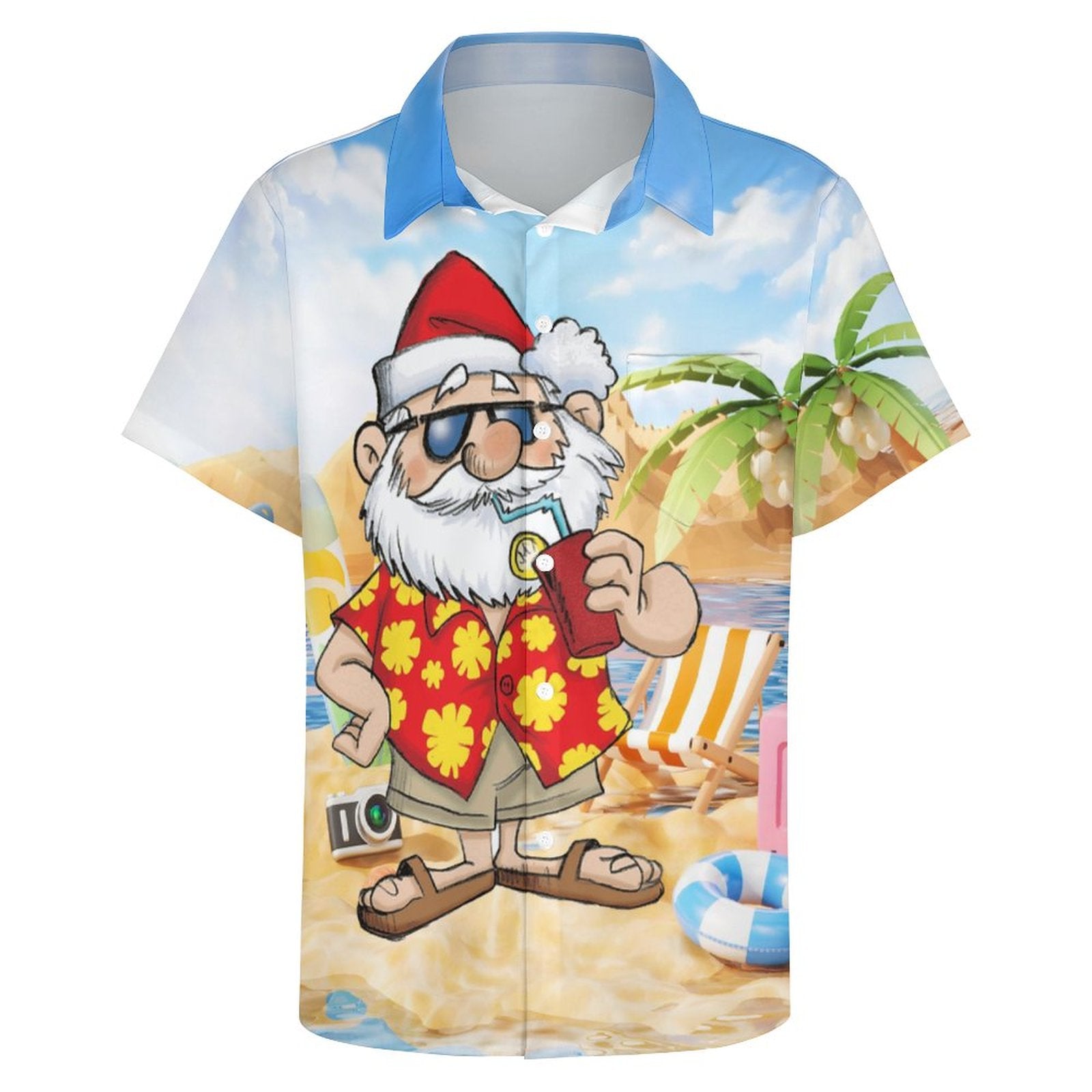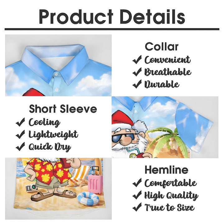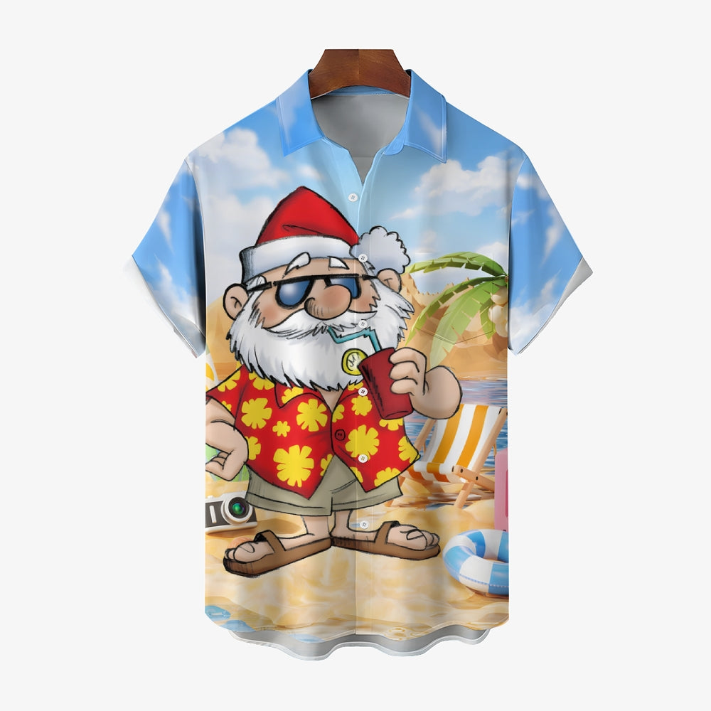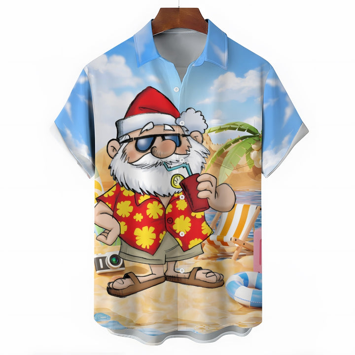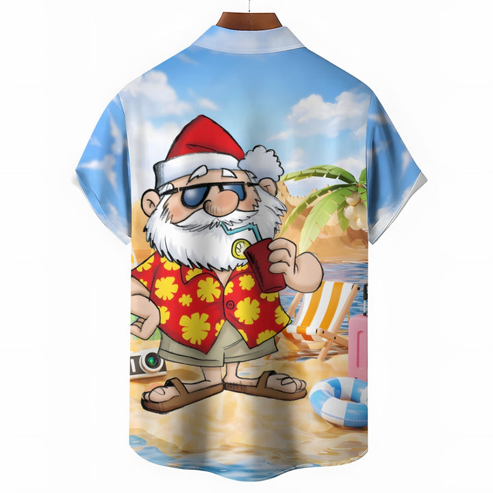Santa's Beach Vacation Casual Print Chest Pocket Short Sleeve Shirt 2308100154
