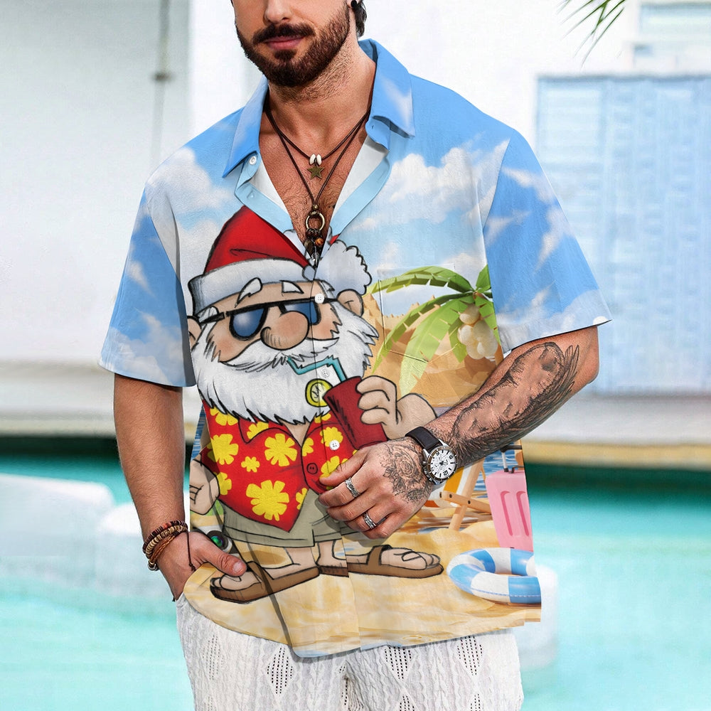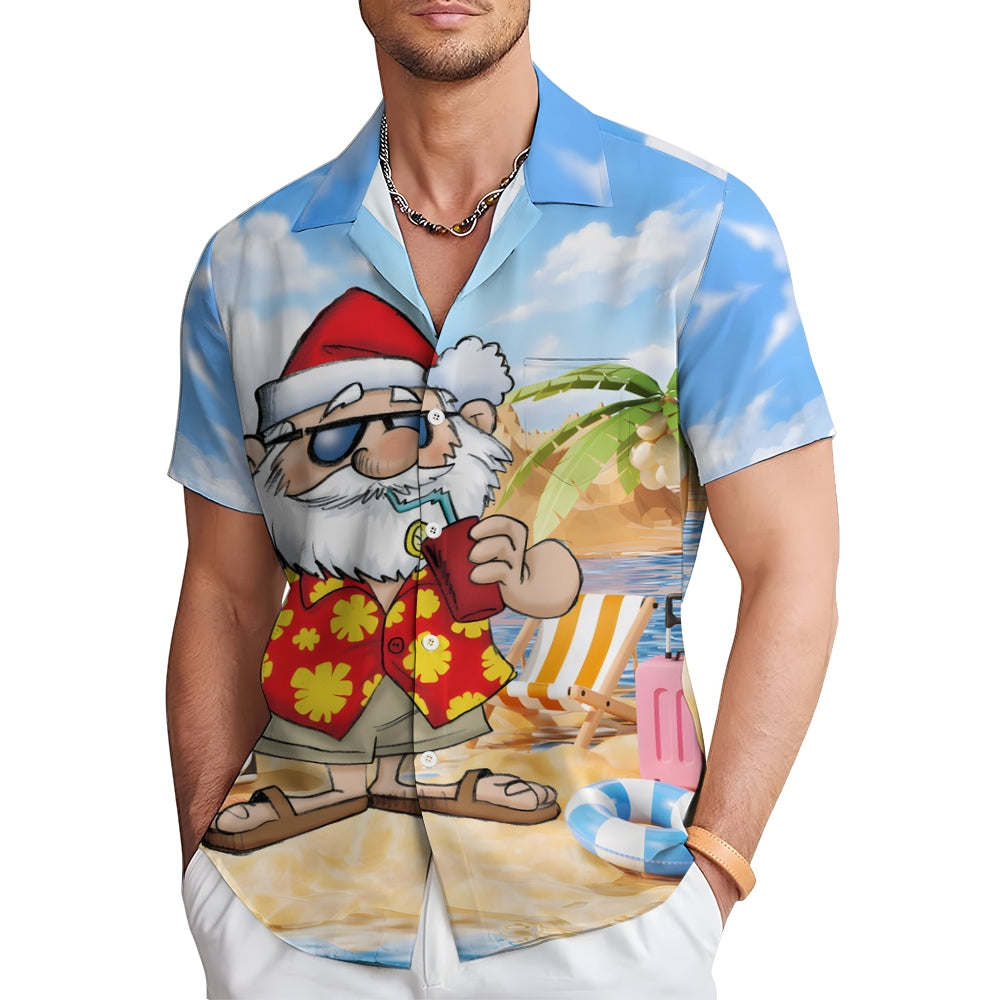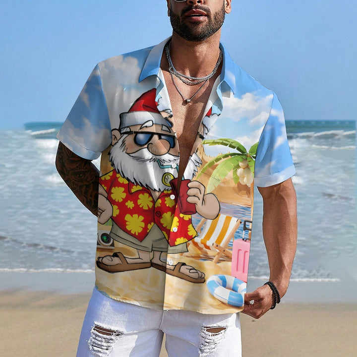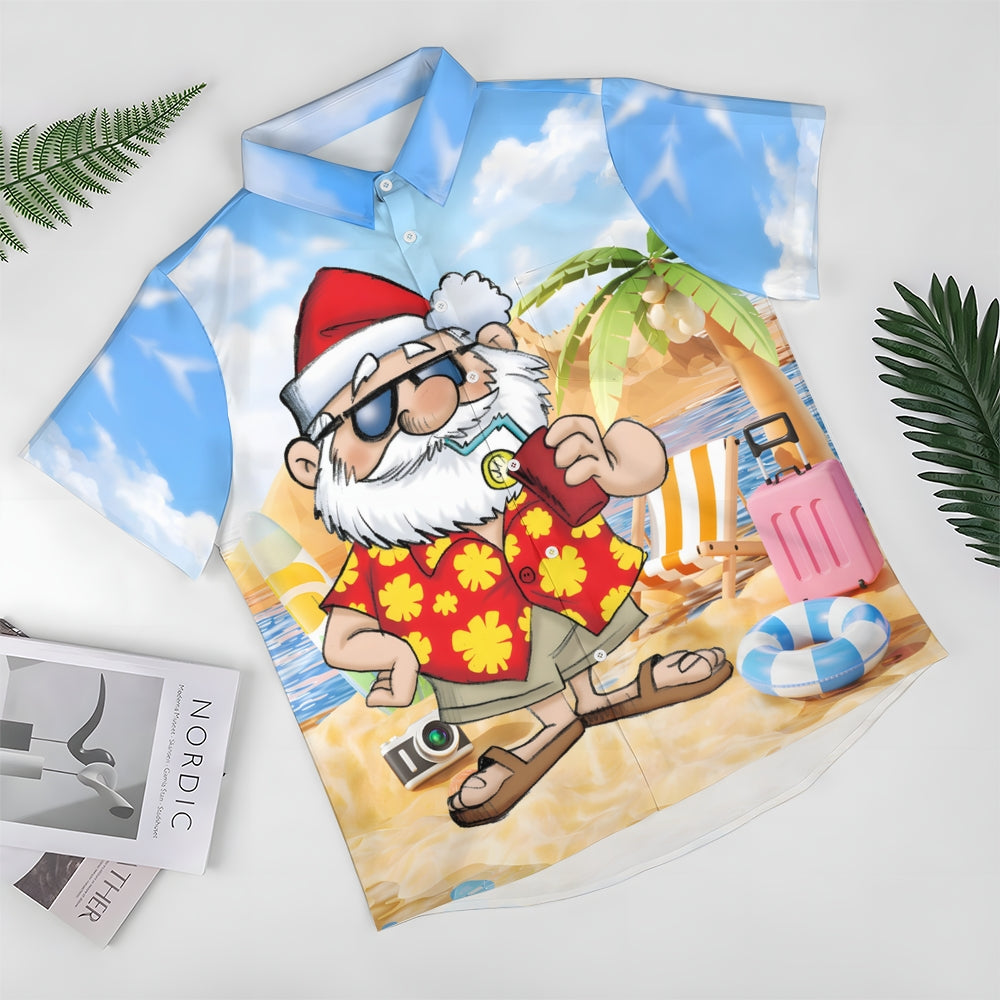 Santa's Beach Vacation Casual Print Chest Pocket Short Sleeve Shirt 2308100154
