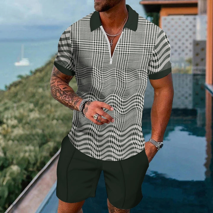 Short Sleeve Zip Polo Check Print Board Shorts Set 2404001297