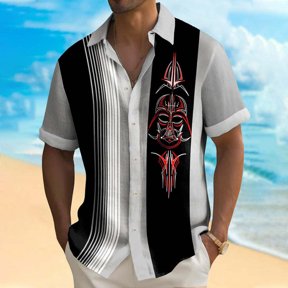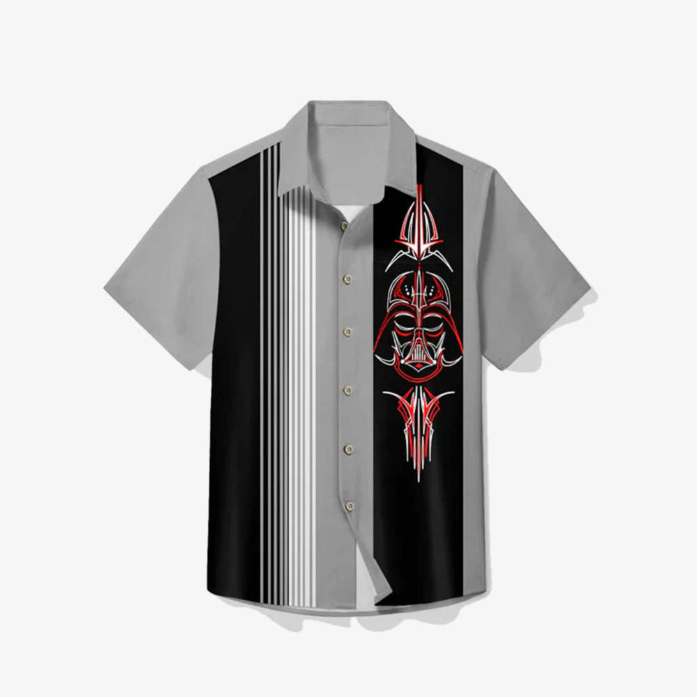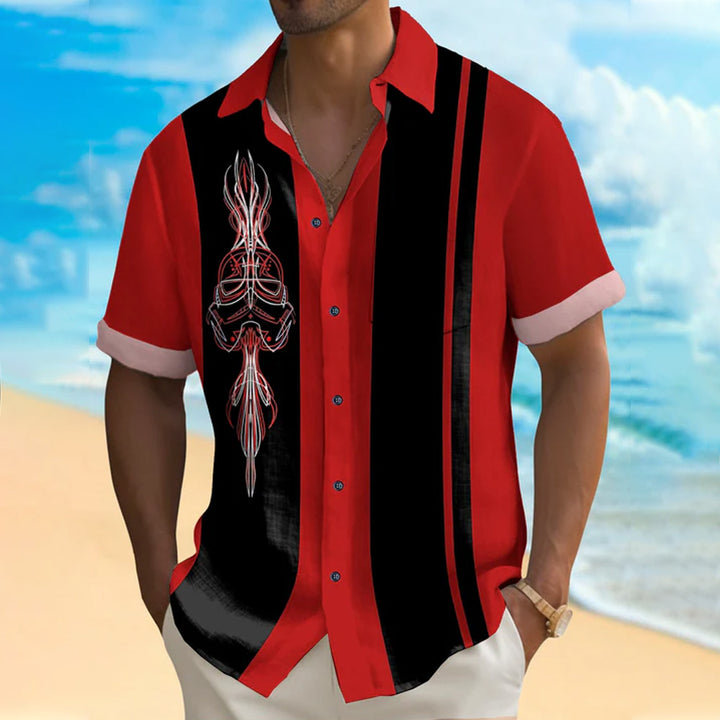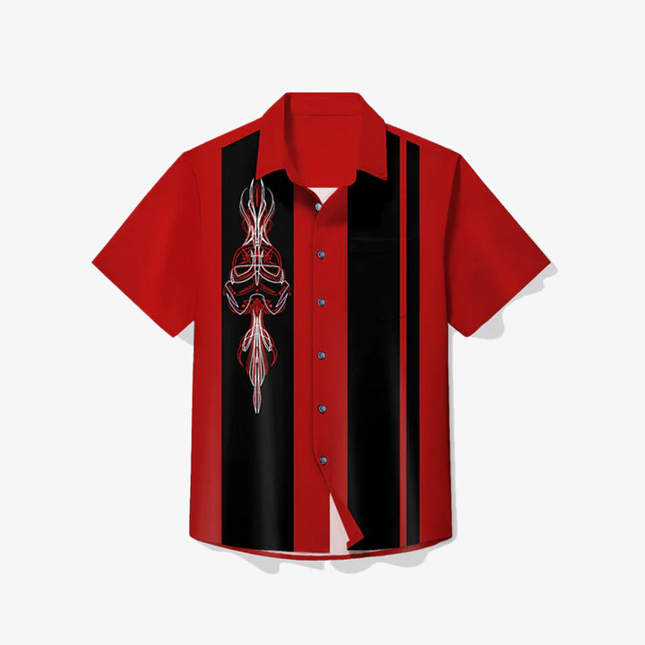 Vintage Bowling Pinstripe Samurai Print Casual Short Sleeve Shirt