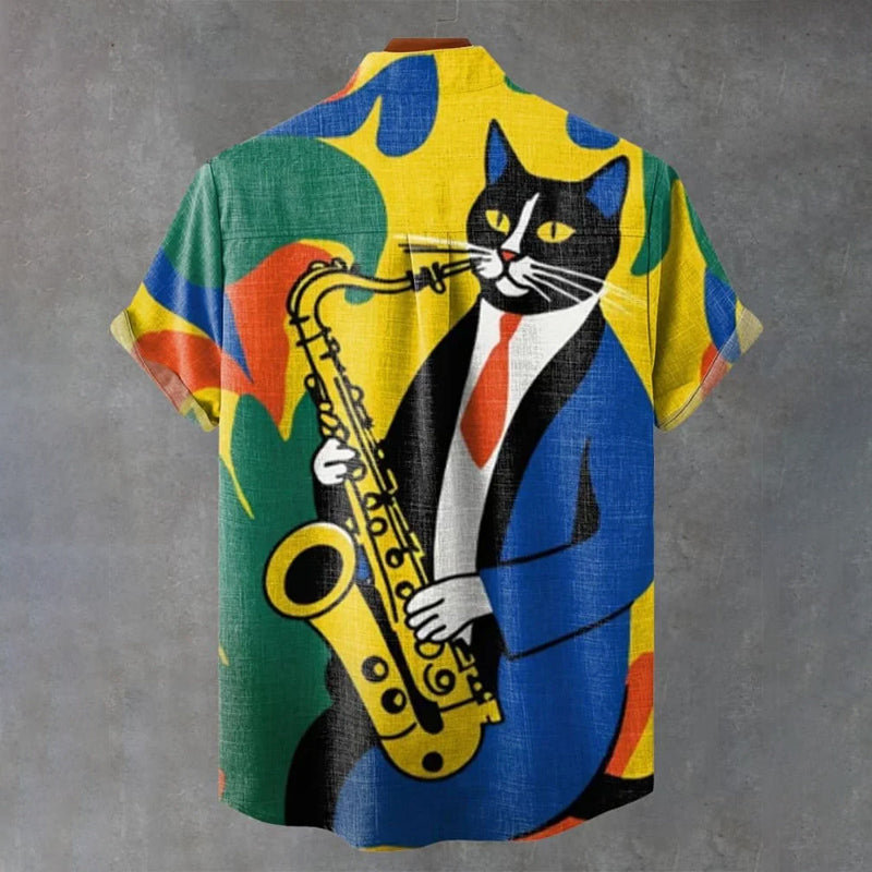 Vintage Mondrian Art Cat Playing Saxophone Cat Print Casual Shirt 2409000409