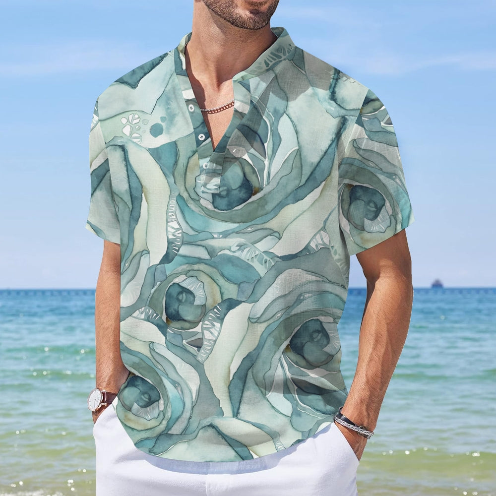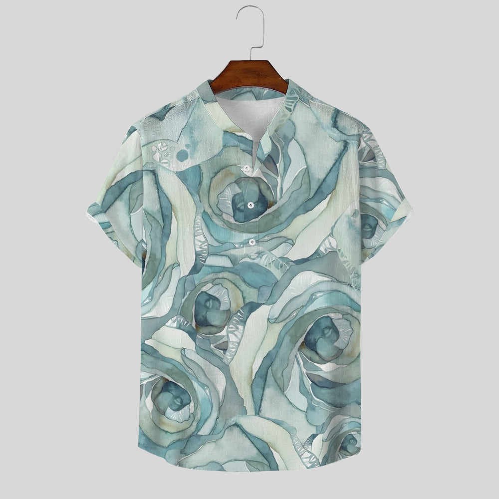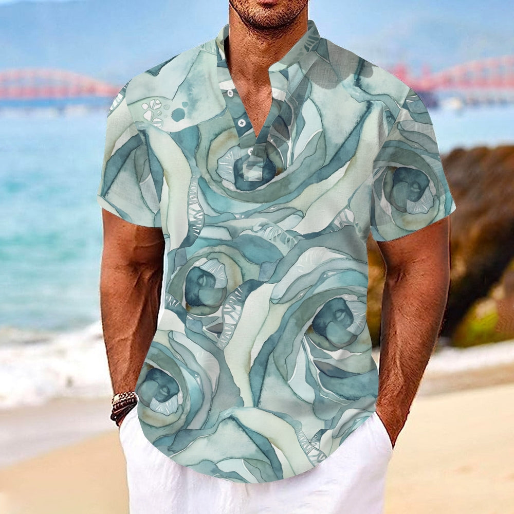 Watercolor Rose Art Print Cotton And Linen Half Lapel Short-Sleeved Shirt 2405001043